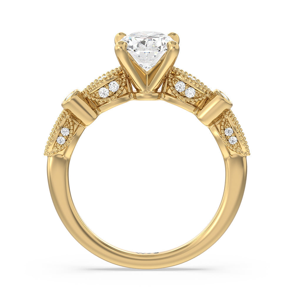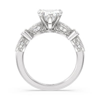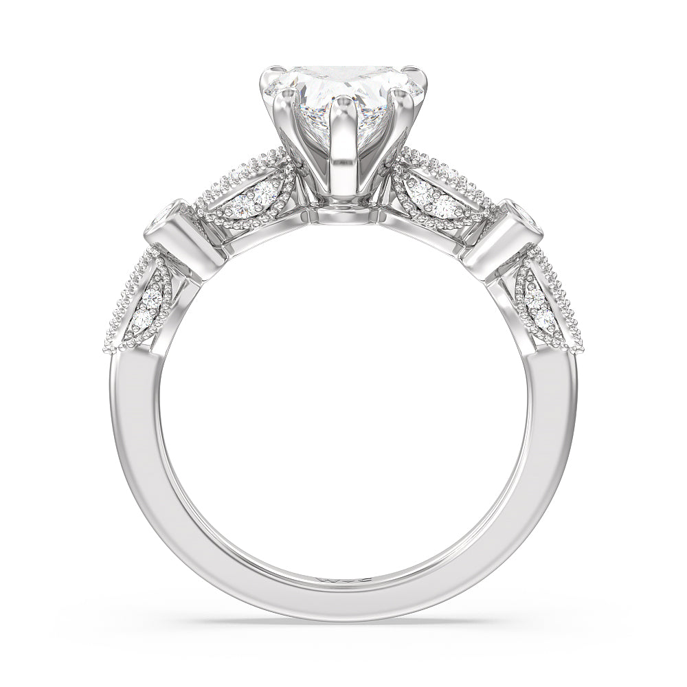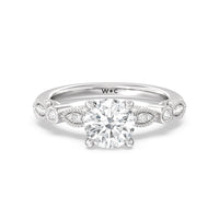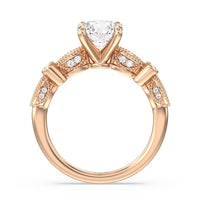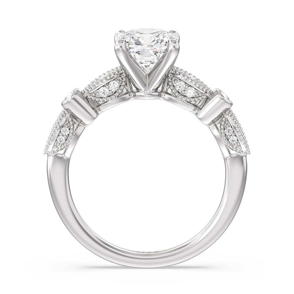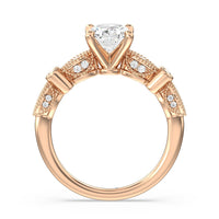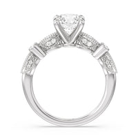 The intricate detailing of this Art Deco style highlights its stunning center stone to create a beautifully elegant engagement ring. The diamond-studded vintage motifs combine pave and bezel settings with milgrain embellishment for added sparkle.