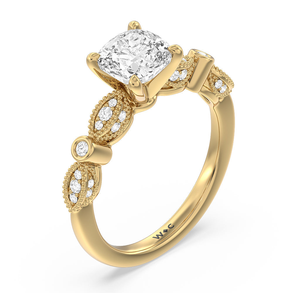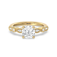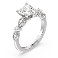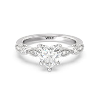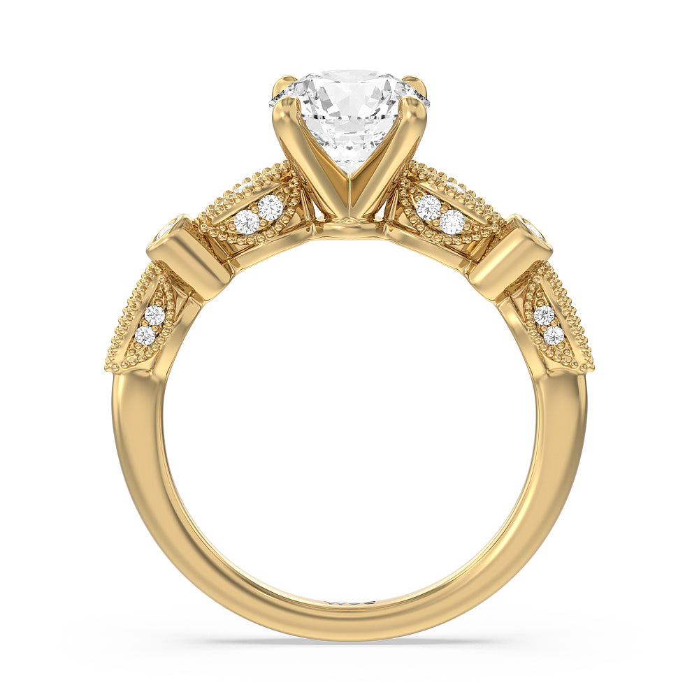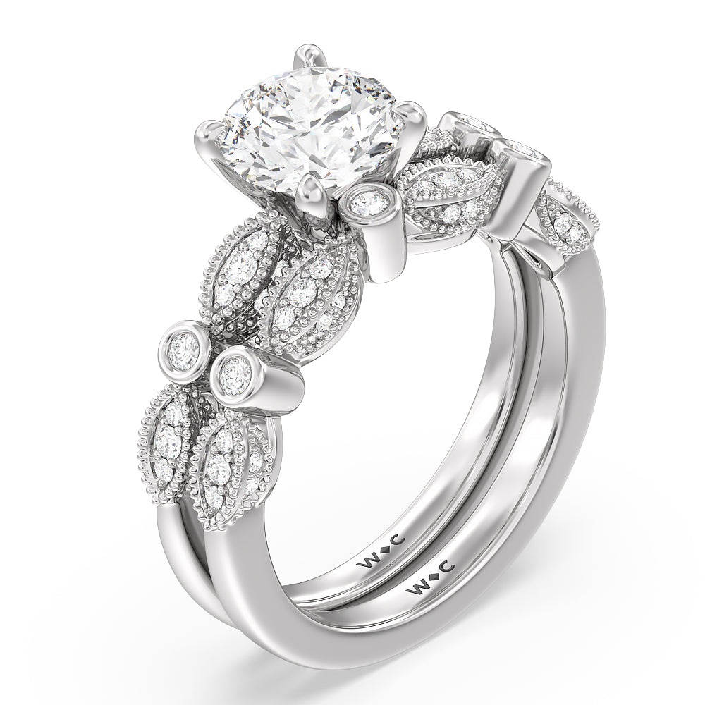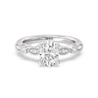 The intricate detailing of this Art Deco style highlights its stunning center stone to create a beautifully elegant engagement ring. The diamond-studded vintage motifs combine pave and bezel settings with milgrain embellishment for added sparkle.