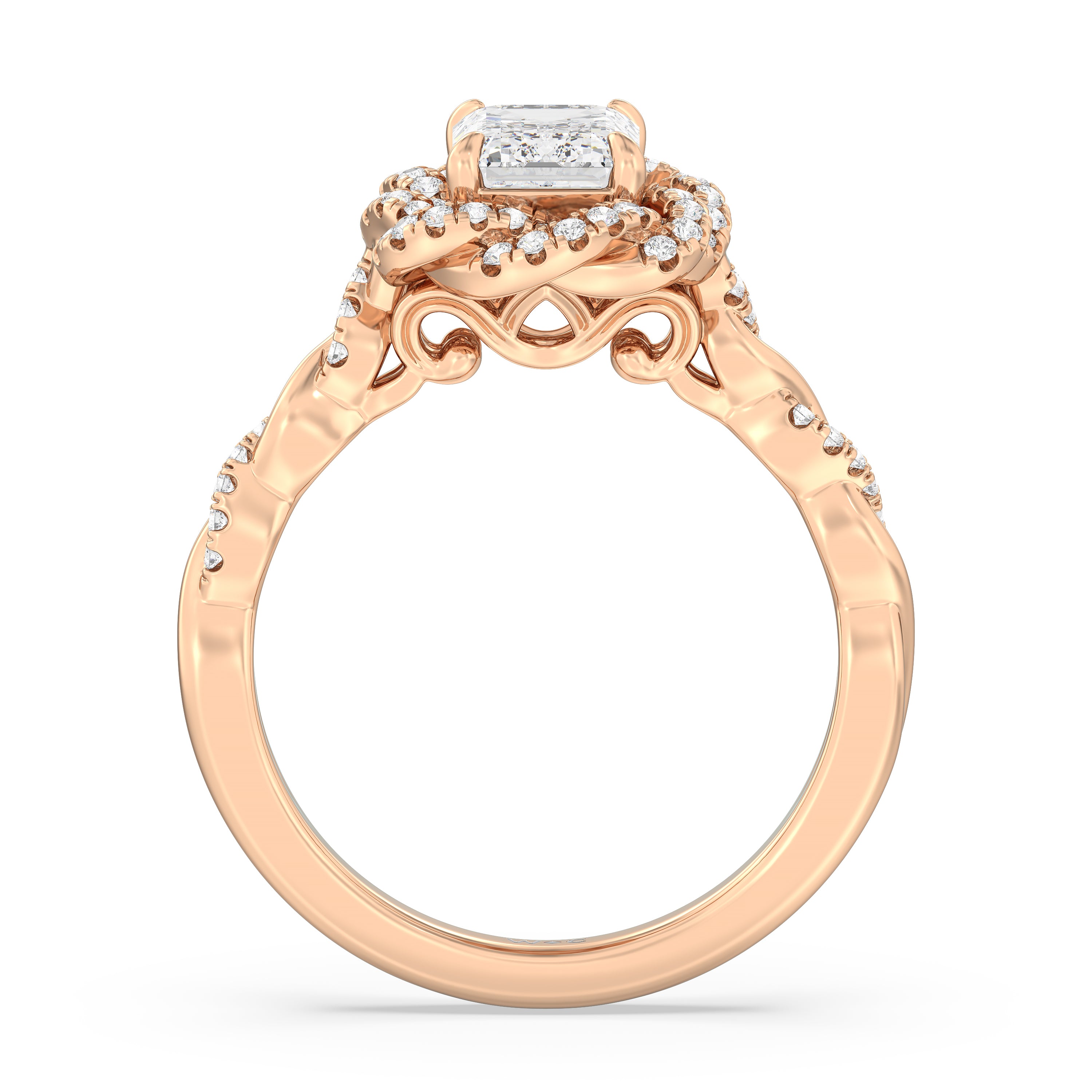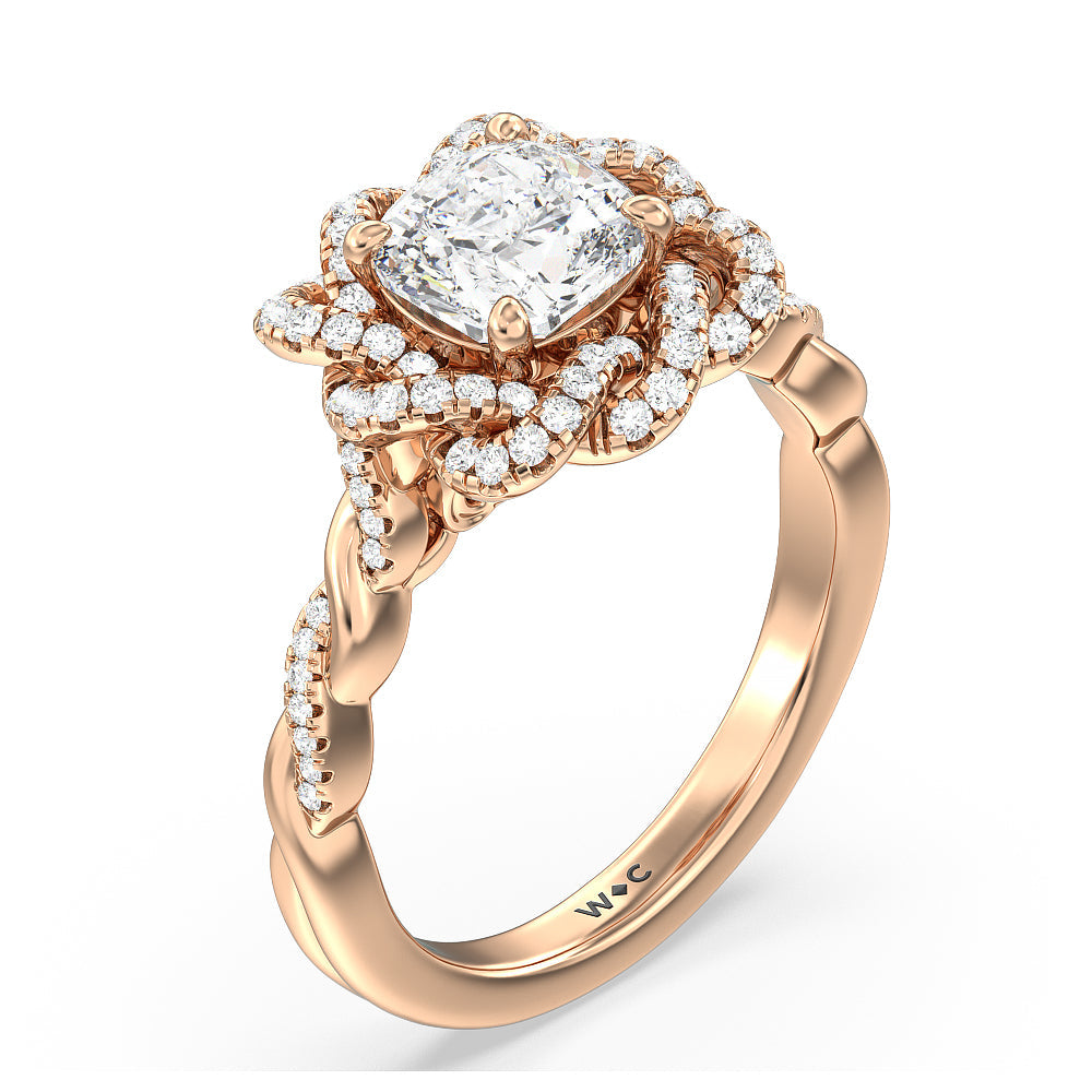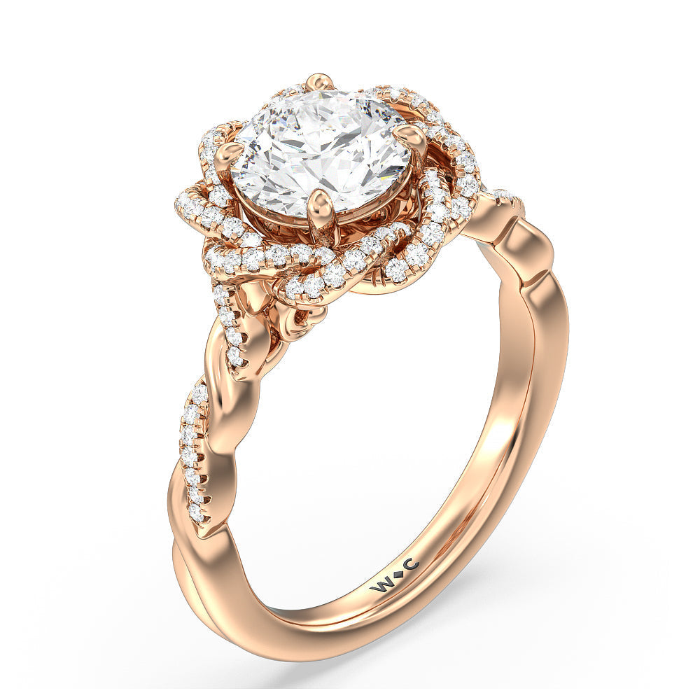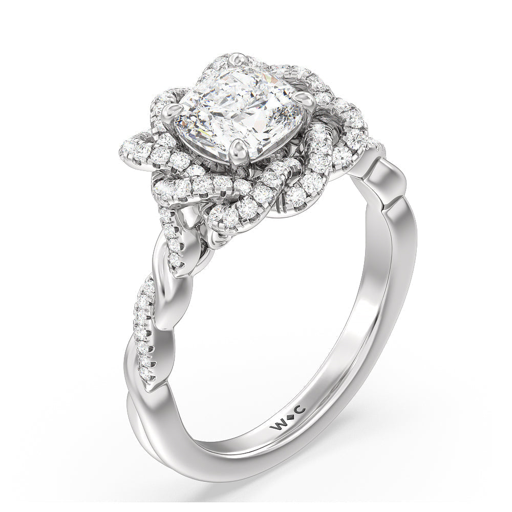 This vintage style showcases a dazzling center stone in a classic claw-prong setting amidst the beautifully arranged petals of its floral-look halo. Soft ribbon detailing twists together with pave diamonds along the band, complemented by intricate scroll detailing in the gallery.