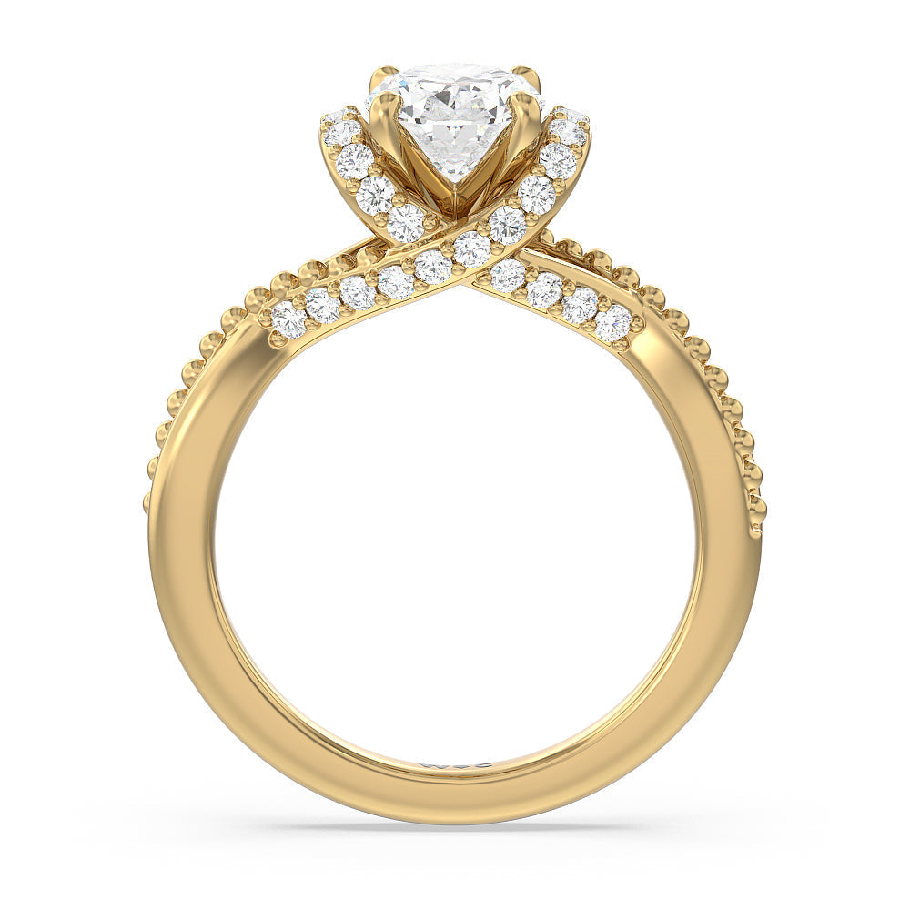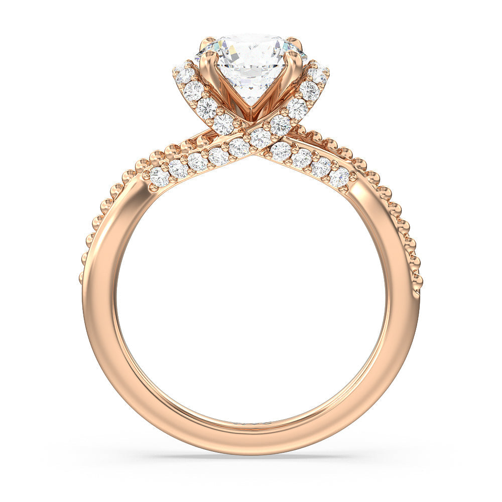 With its stunning vintage-style detail, this engagement ring brings the glamour of the Art Deco era. The shank splits and divides into a beaded and smooth band, crossing over to form a diamond-pave halo for the sparkling center stone to rest in.