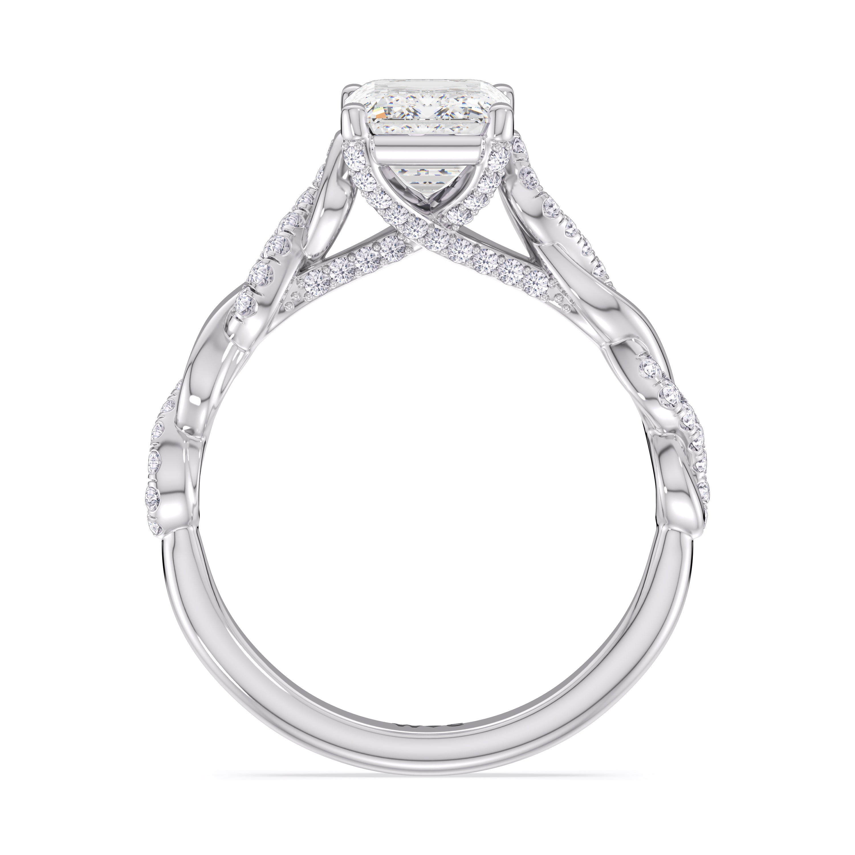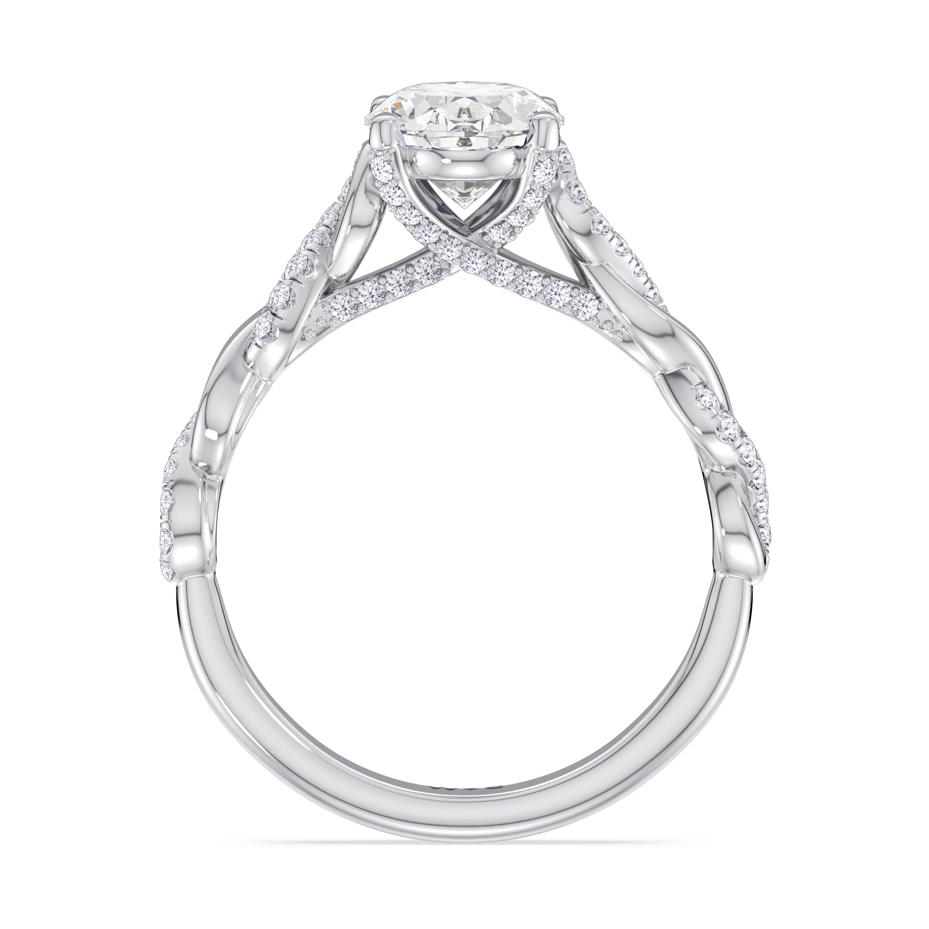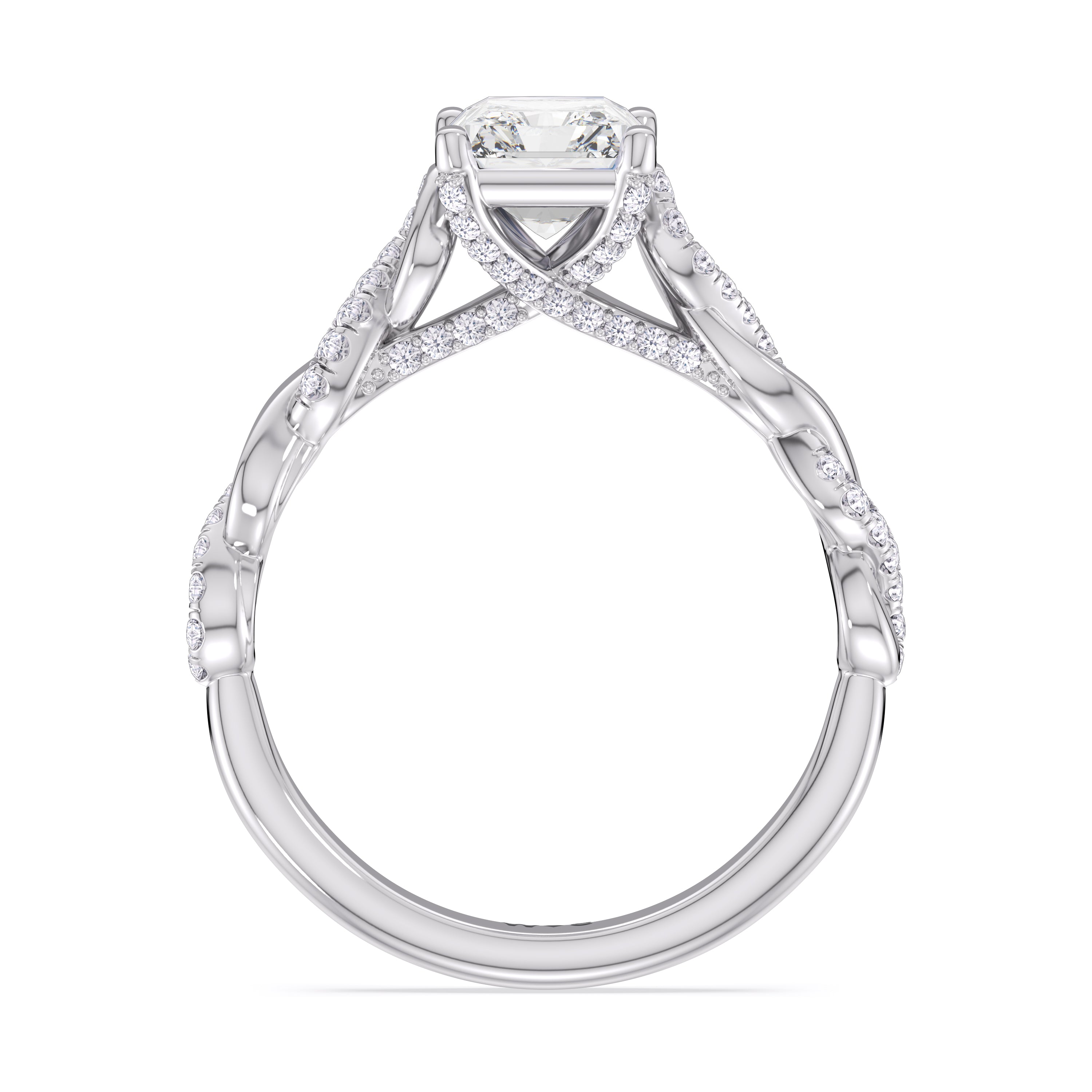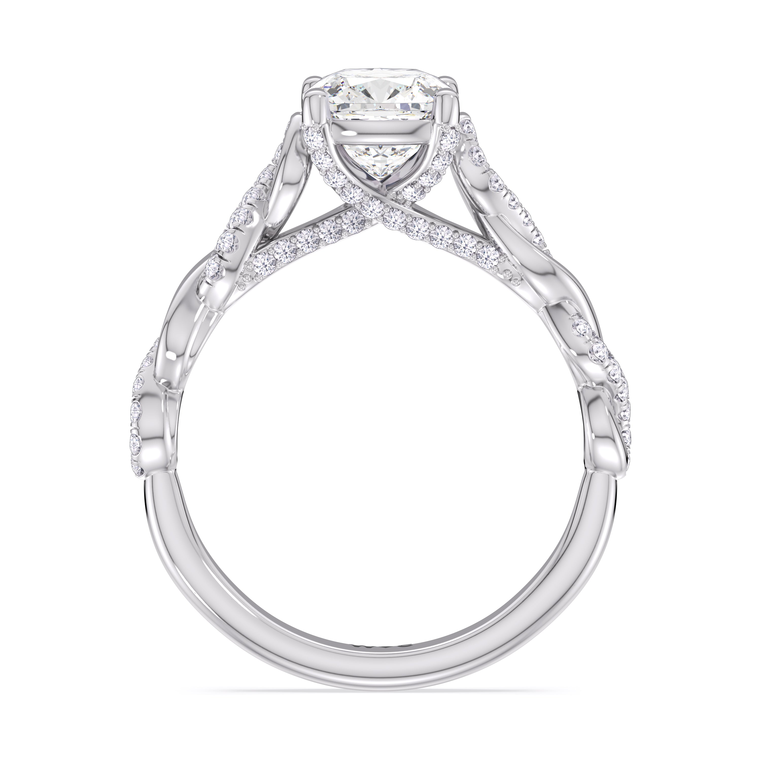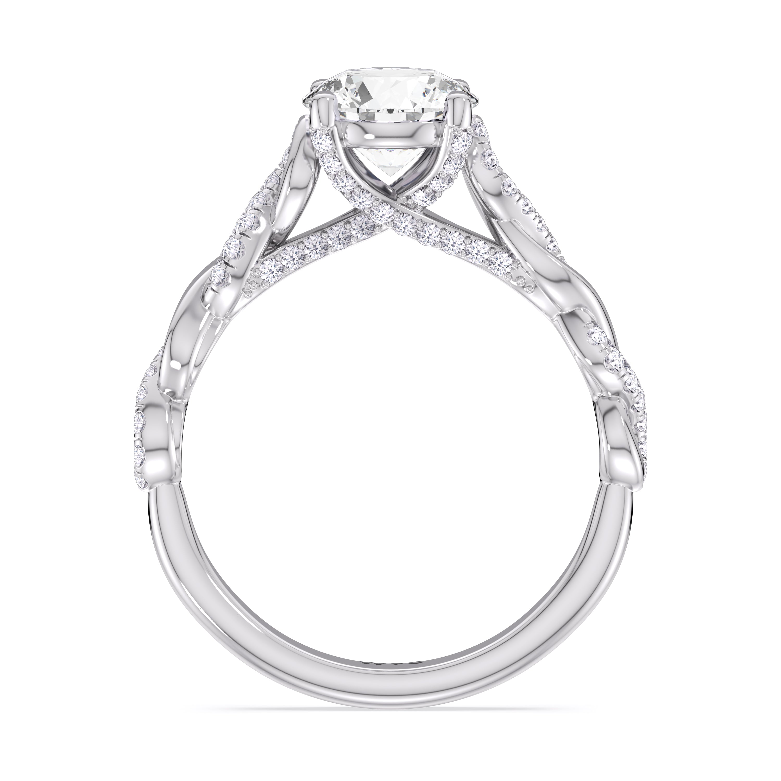 To showcase the dazzling centerpiece of this engagement ring, the embellished band splits to twist over and under itself up to flank the center stone, with the four prongs elegantly formed of sparkling crossover detail in the front view.