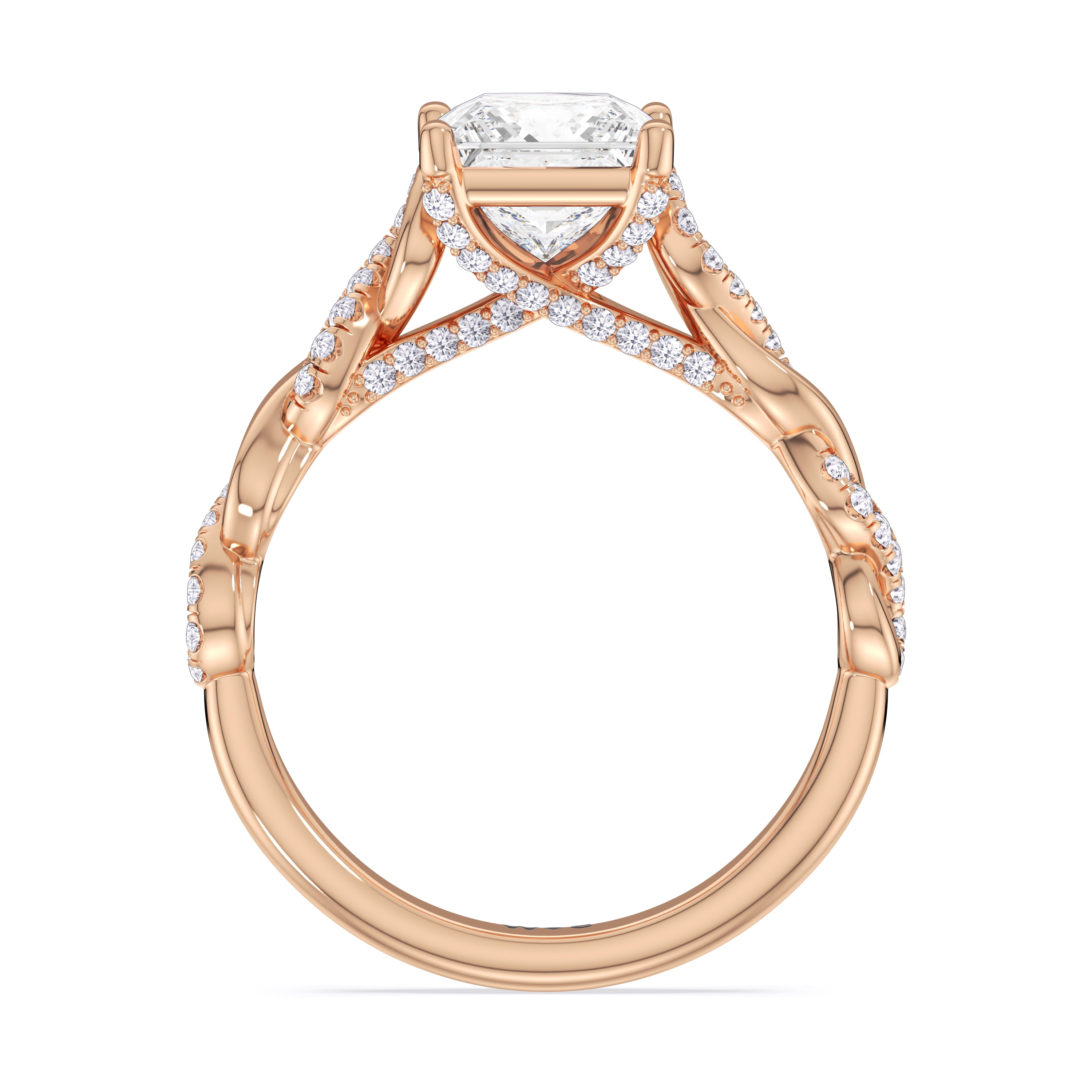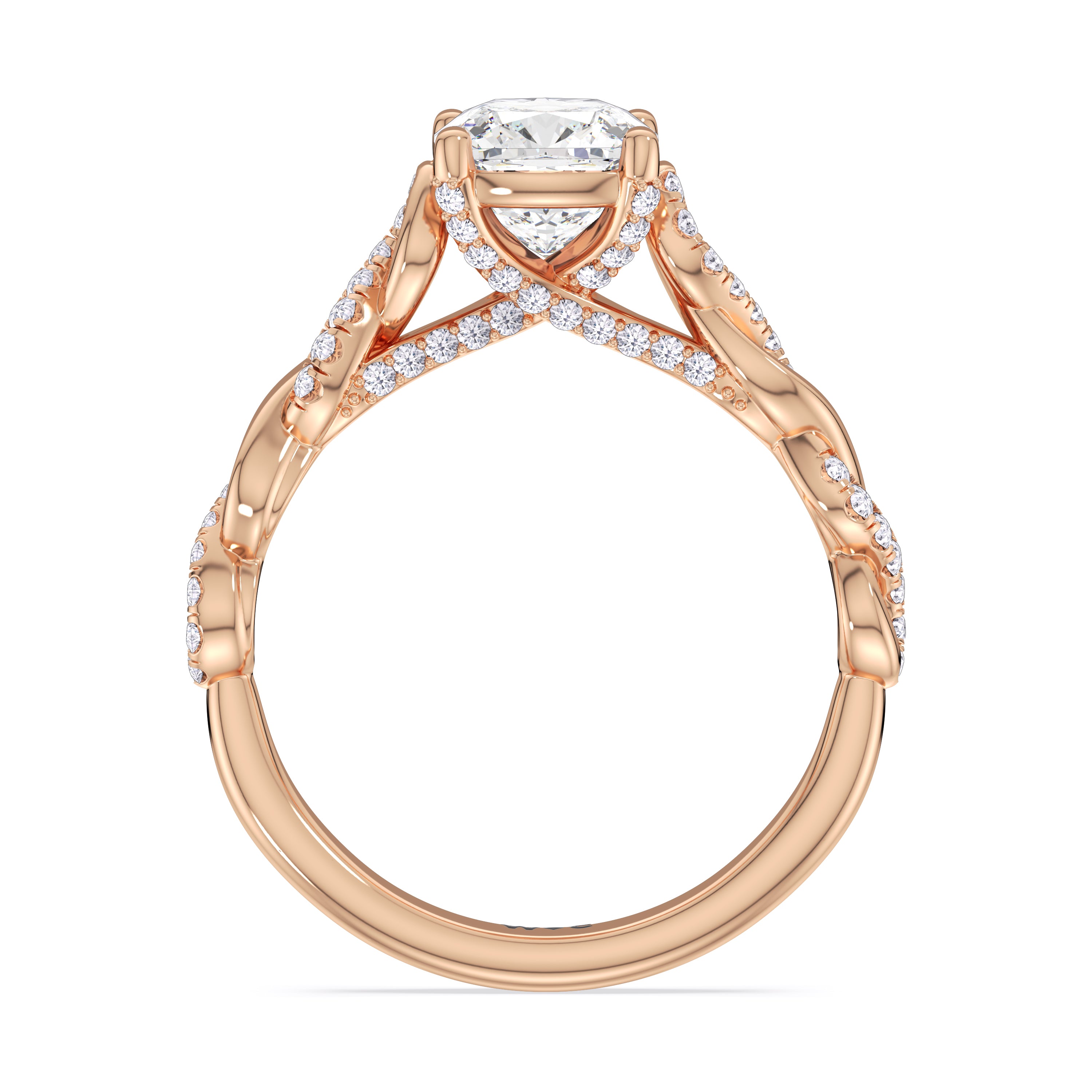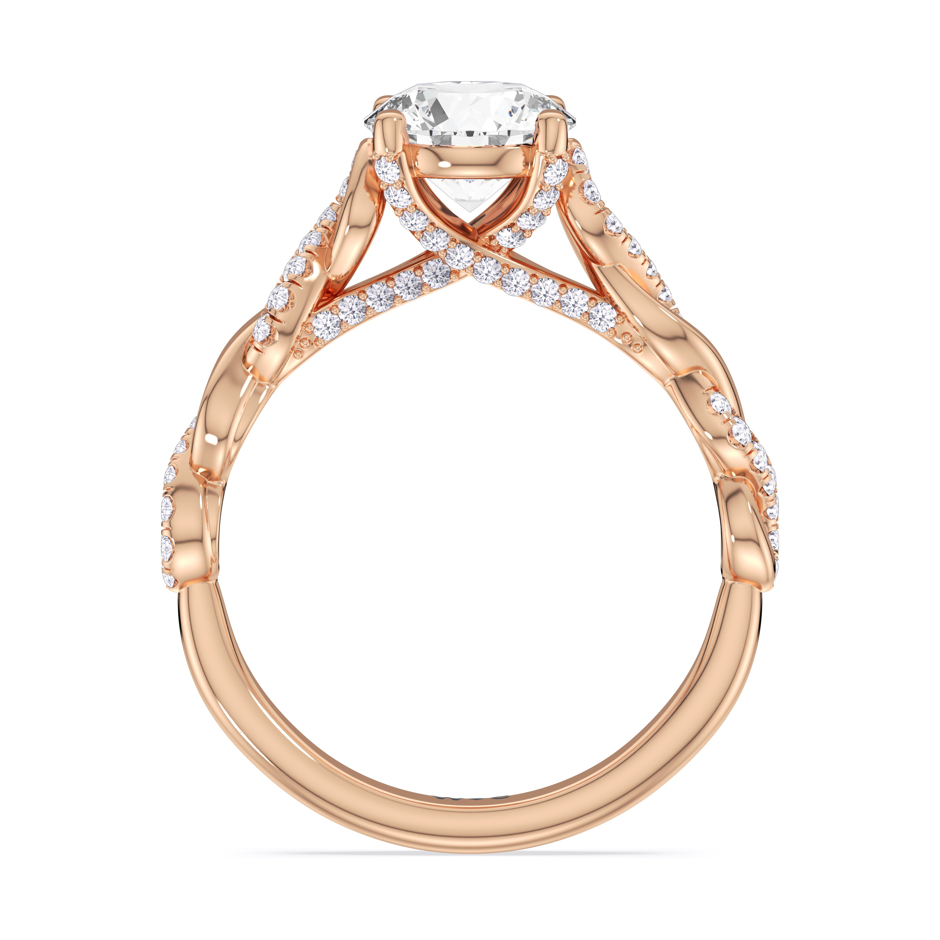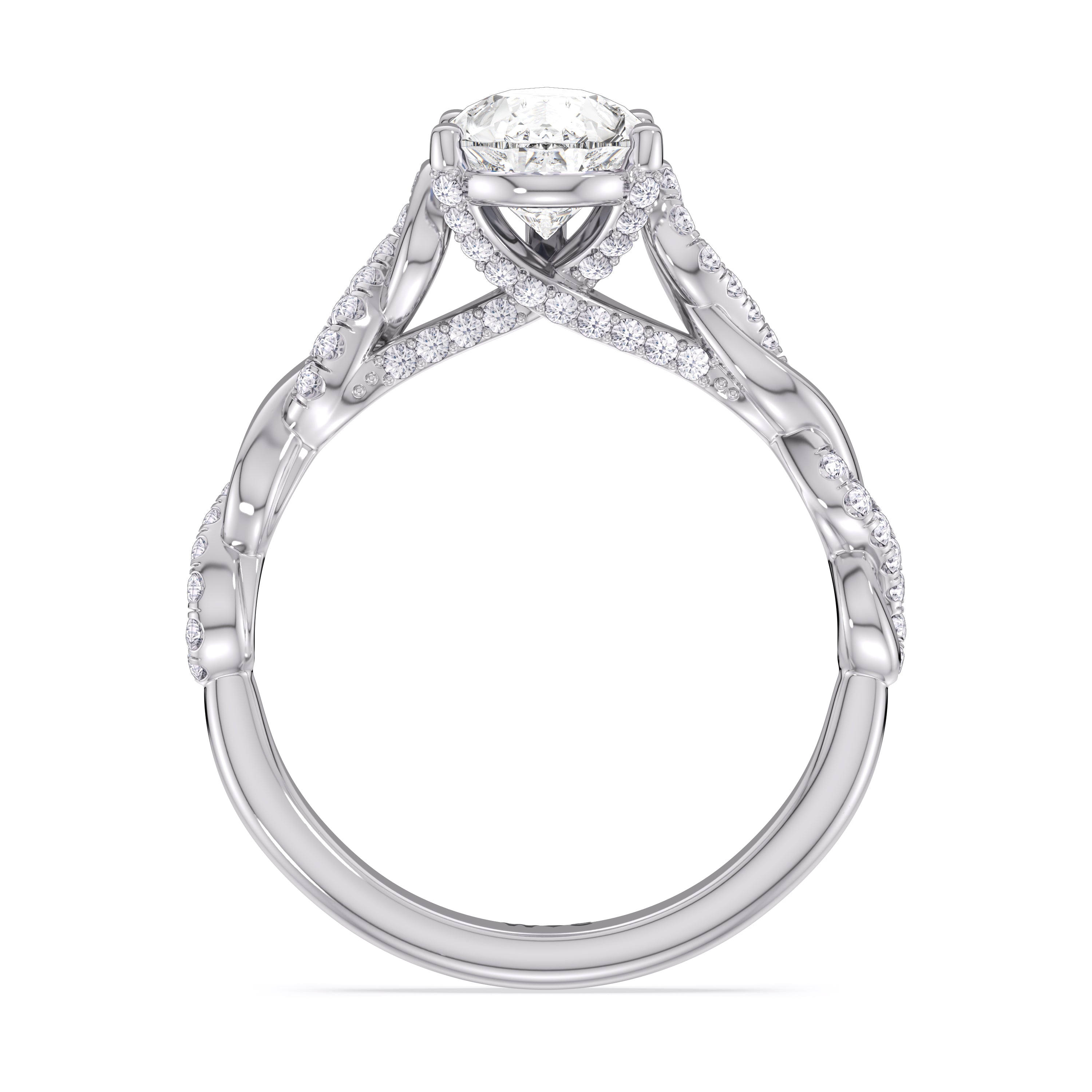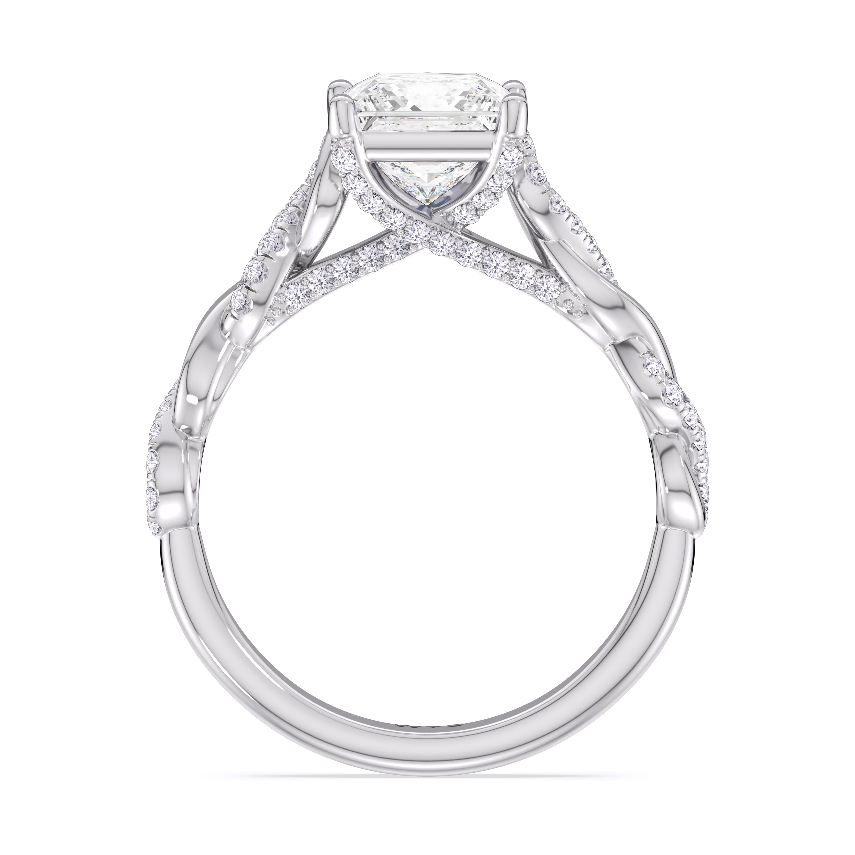 To showcase the dazzling centerpiece of this engagement ring, the embellished band splits to twist over and under itself up to flank the center stone, with the four prongs elegantly formed of sparkling crossover detail in the front view.