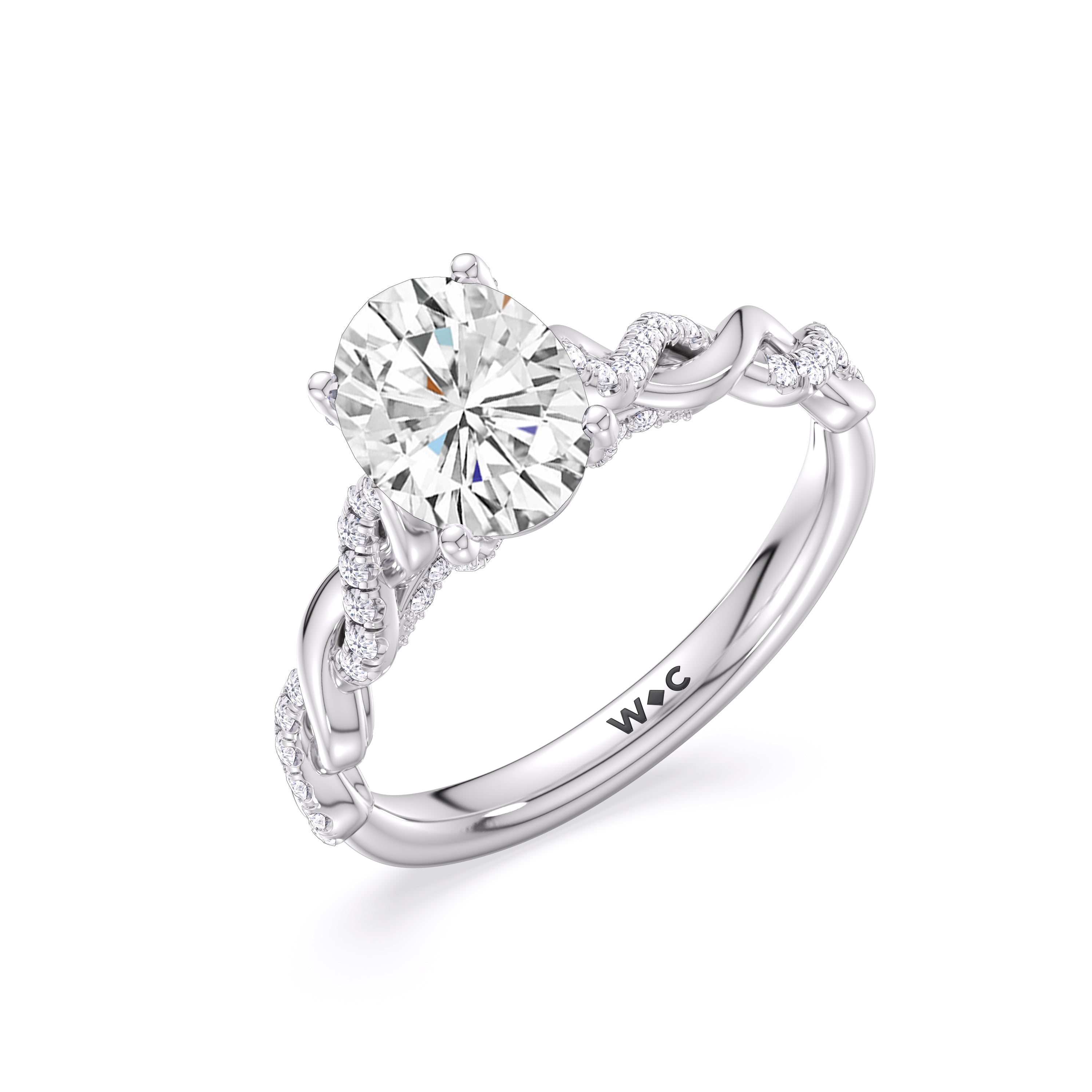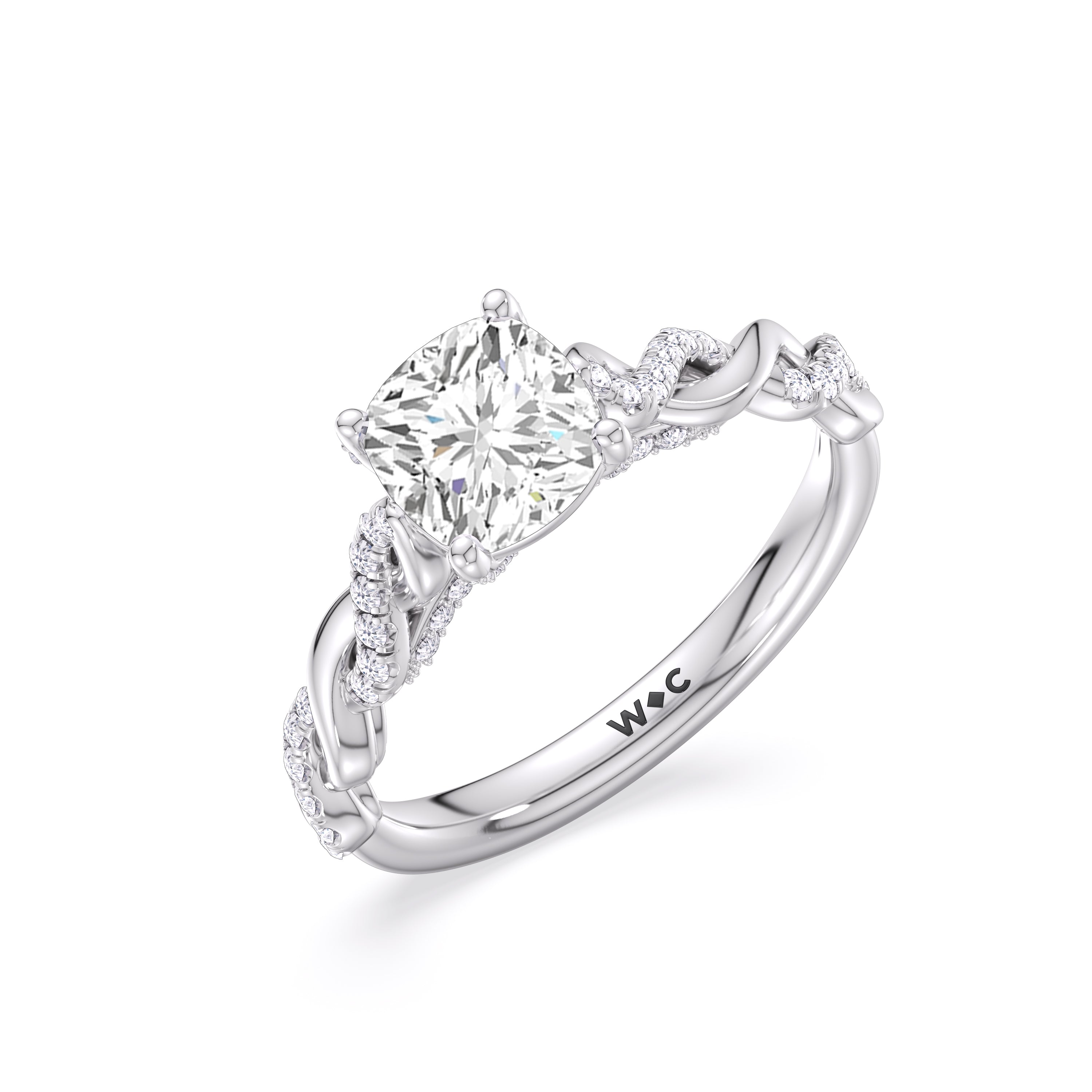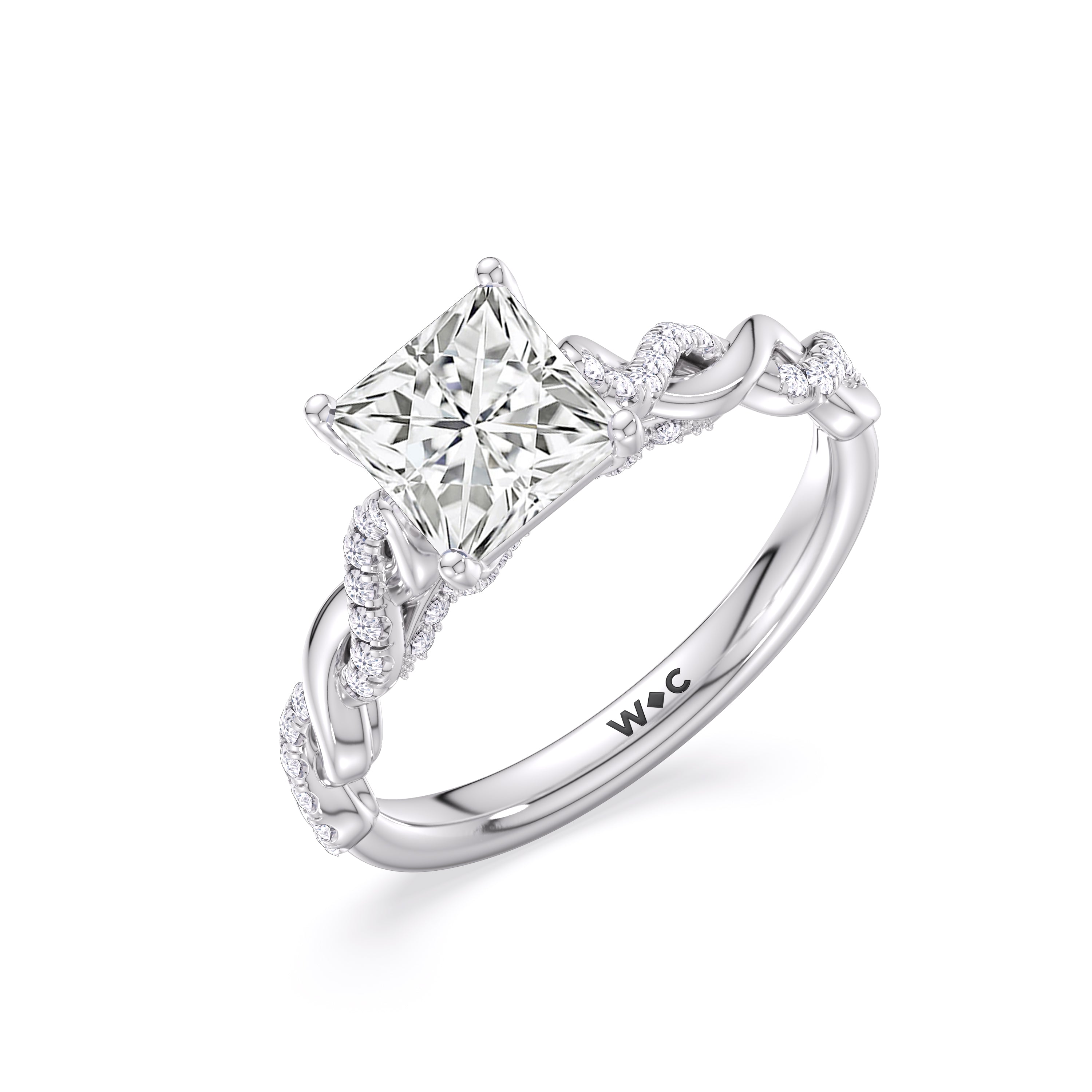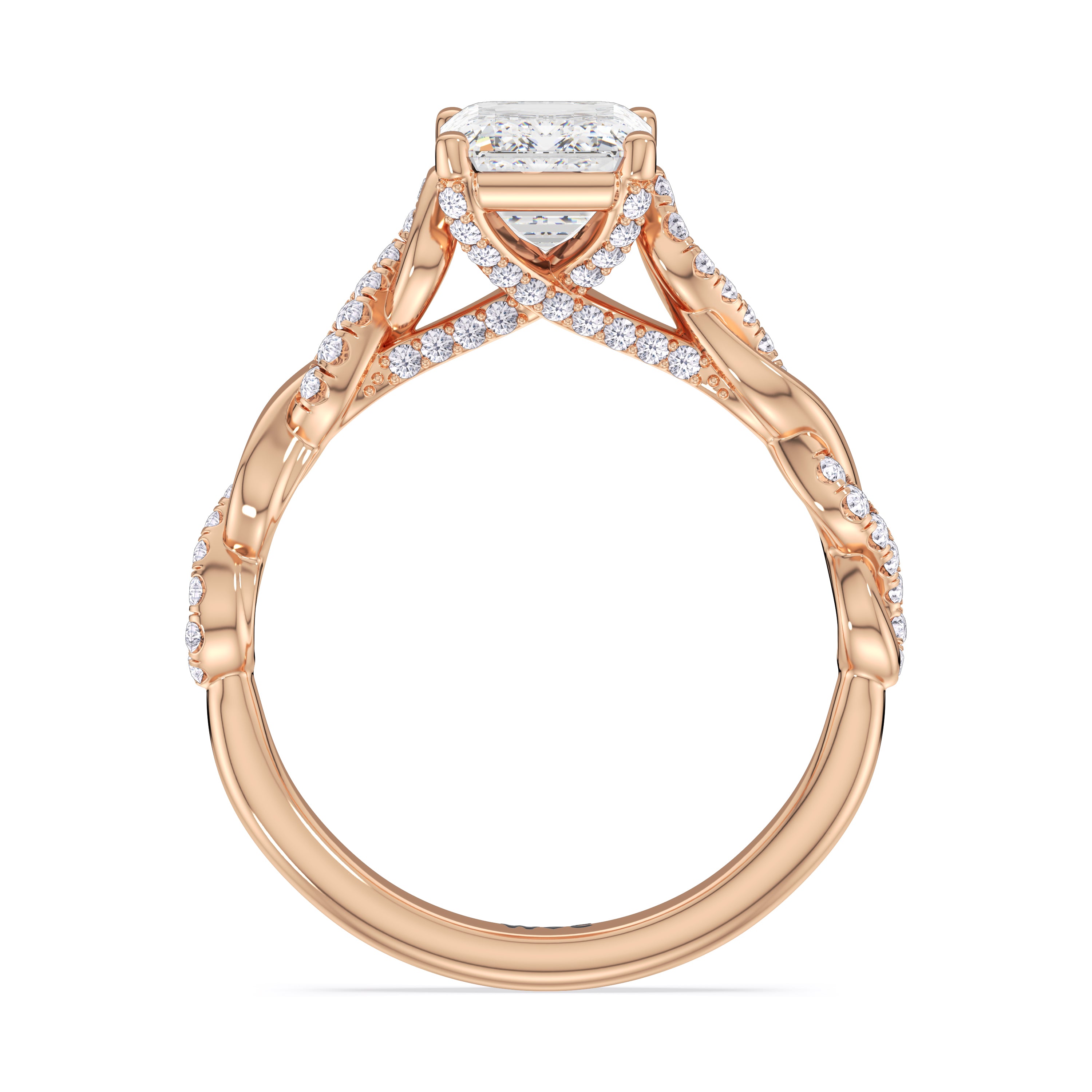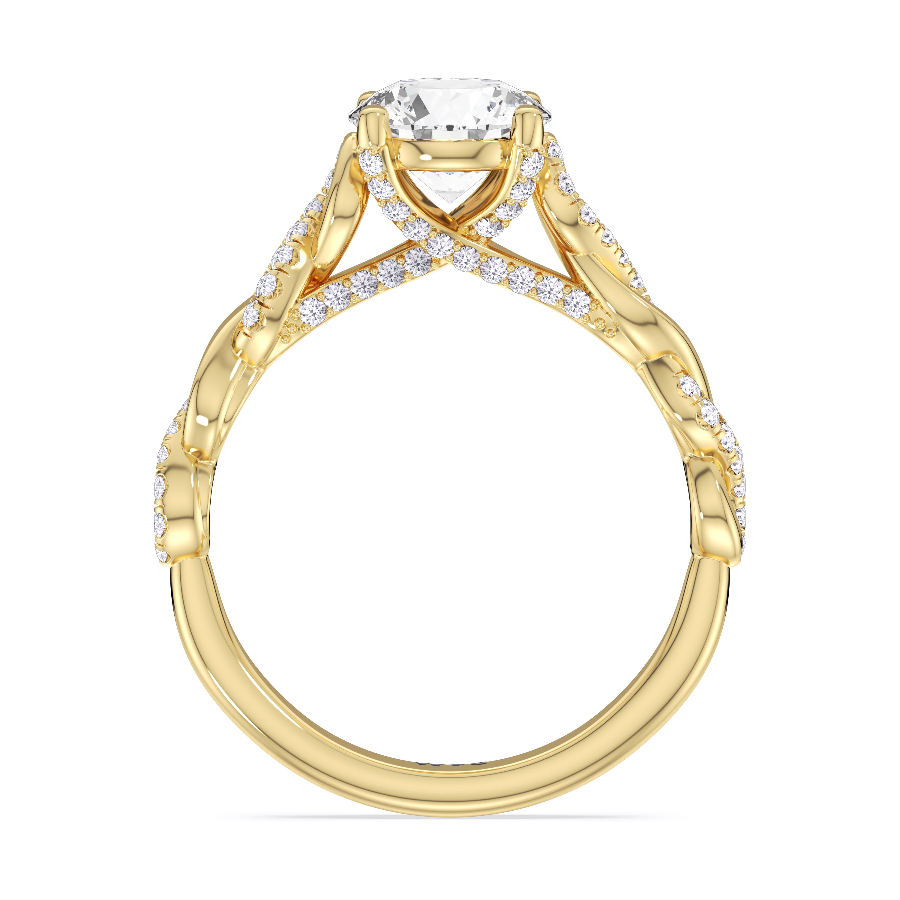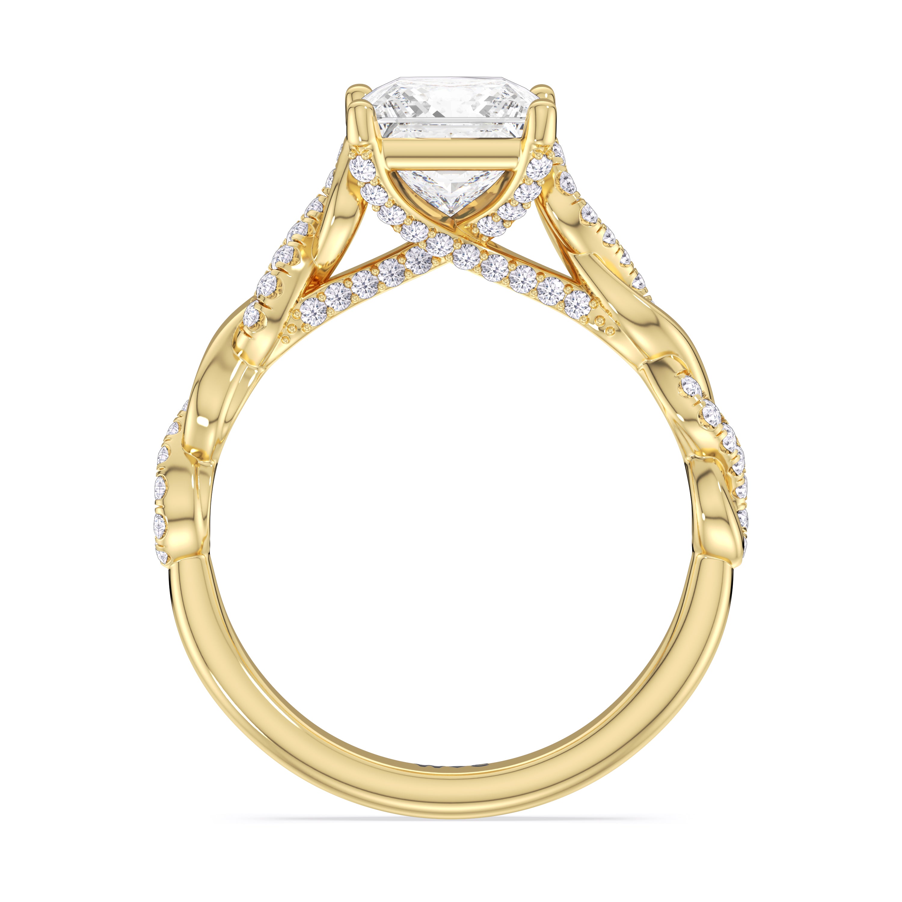 To showcase the dazzling centerpiece of this engagement ring, the embellished band splits to twist over and under itself up to flank the center stone, with the four prongs elegantly formed of sparkling crossover detail in the front view.