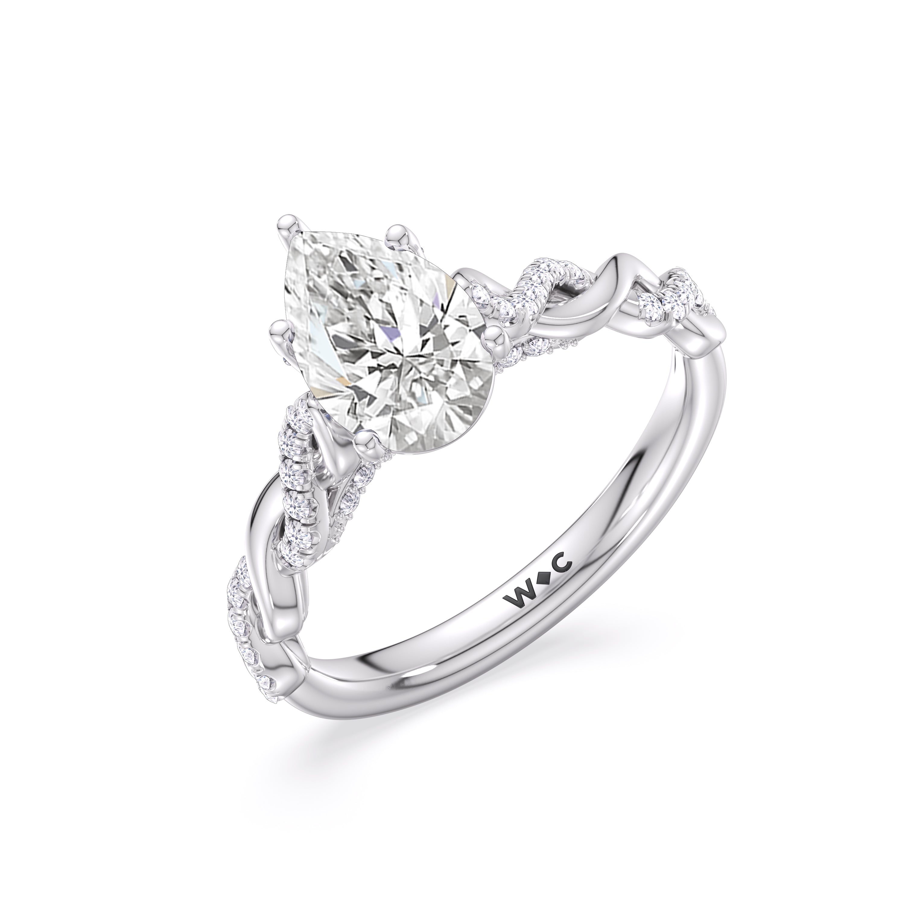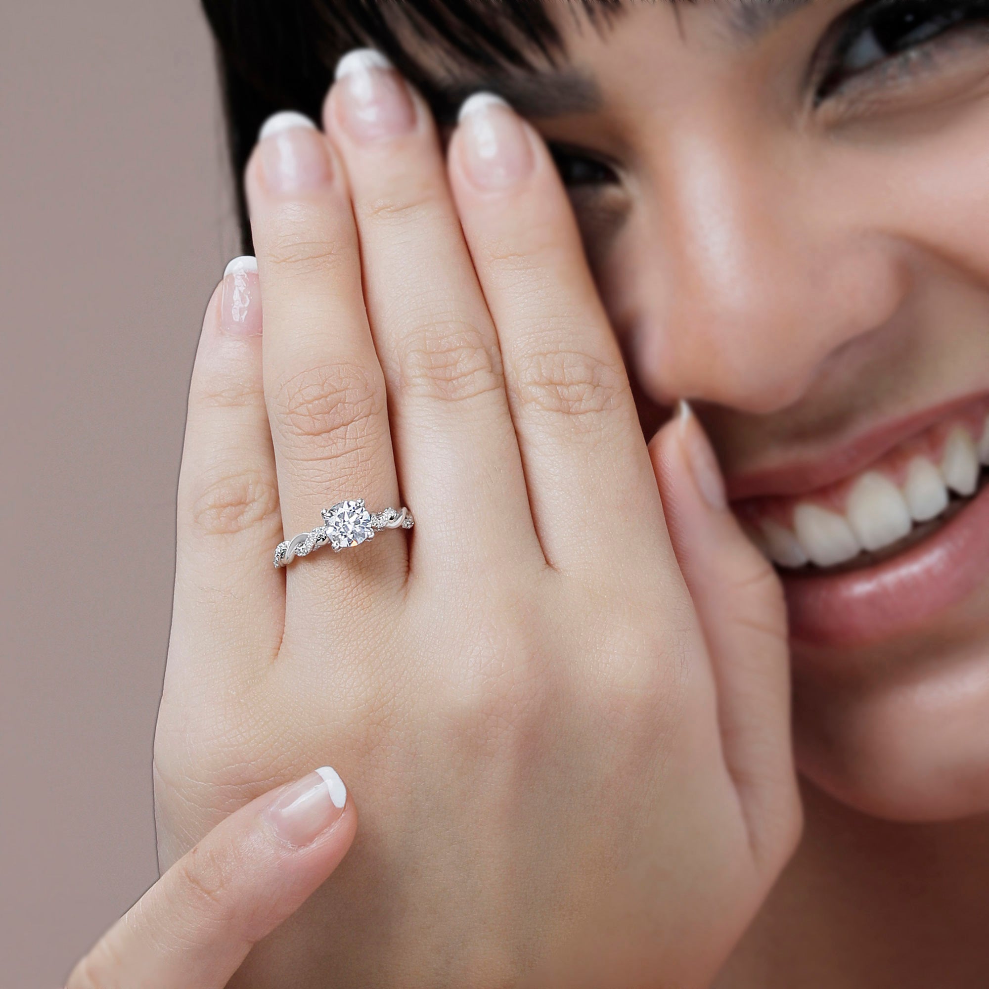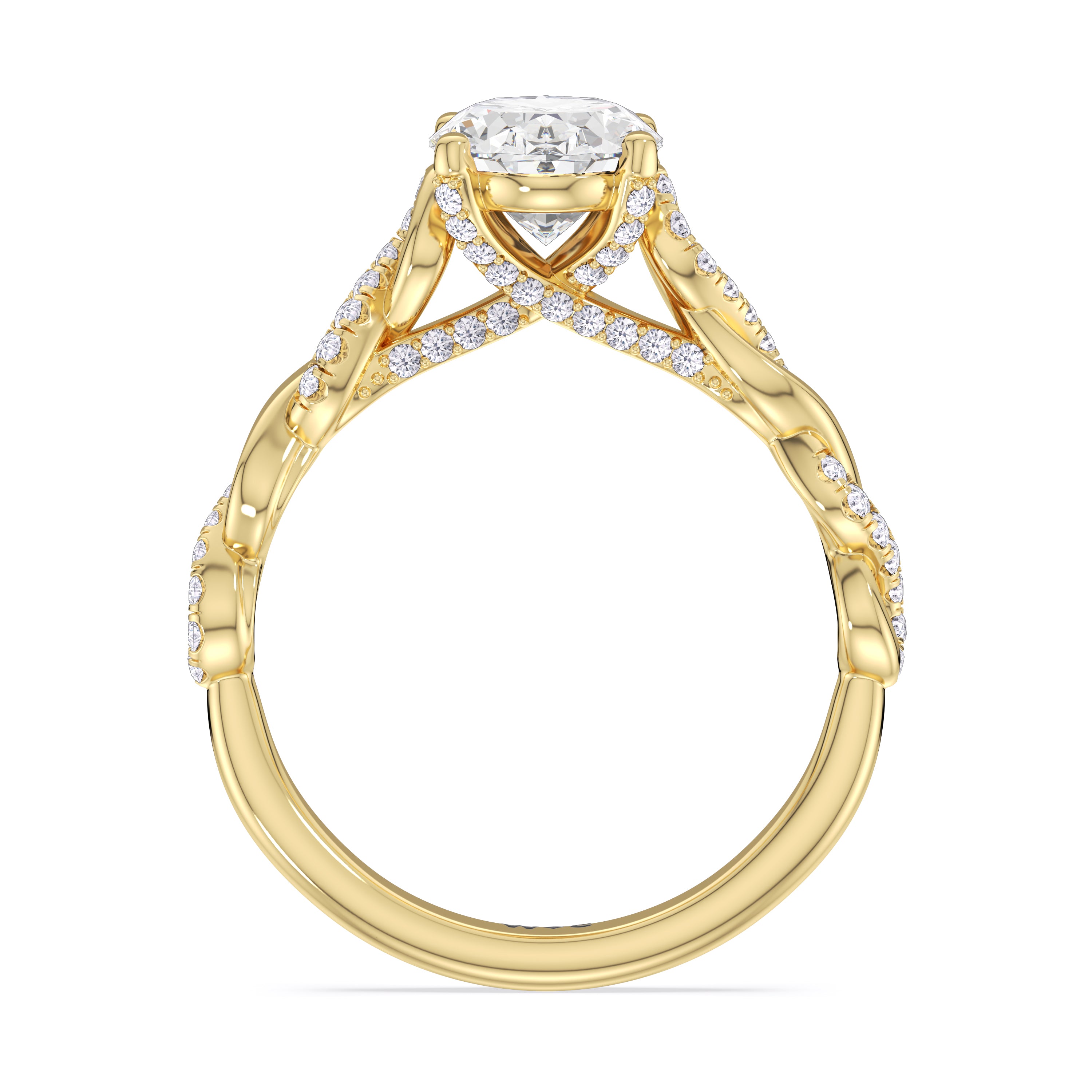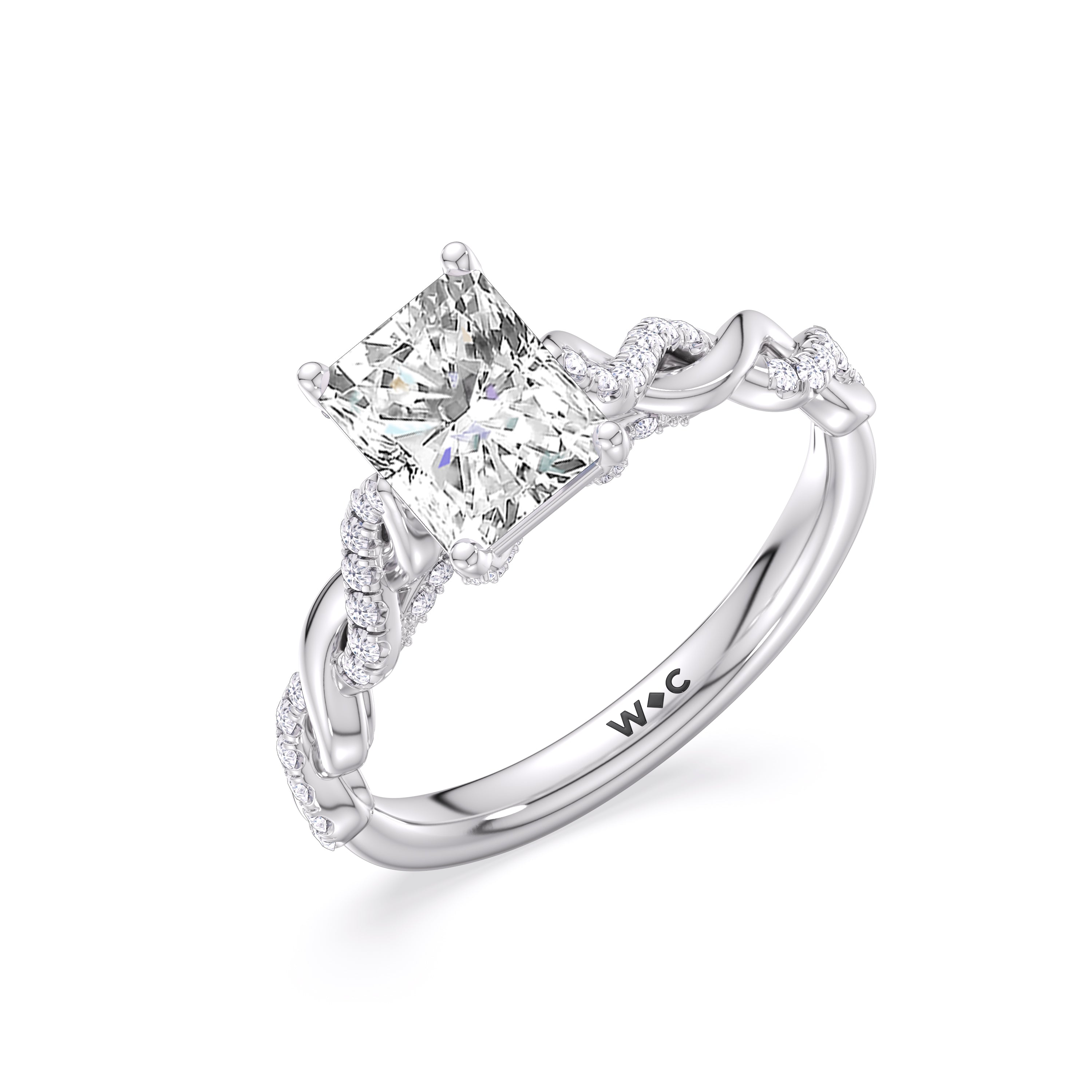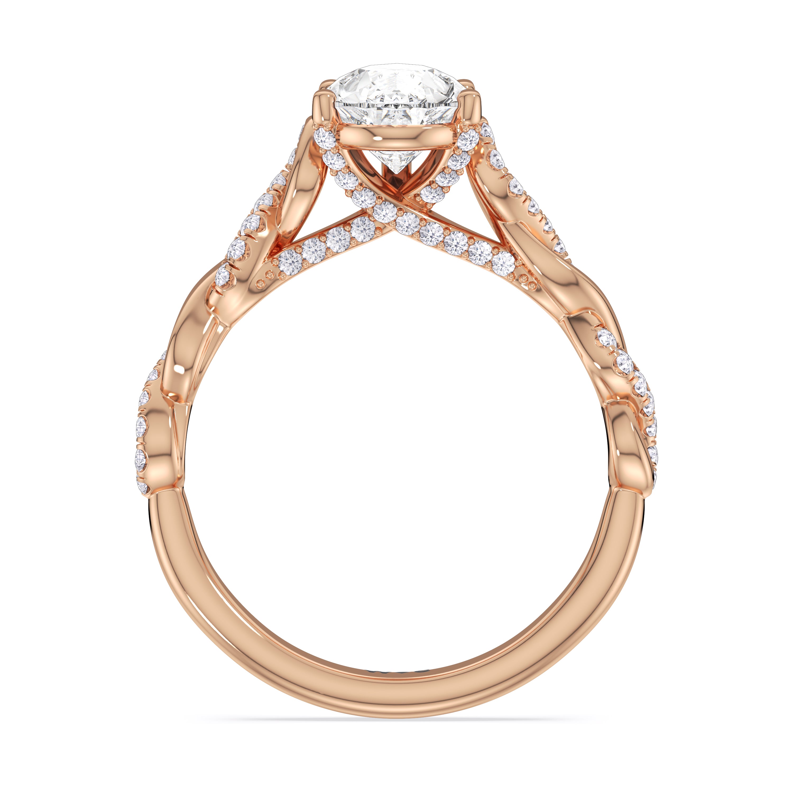 To showcase the dazzling centerpiece of this engagement ring, the embellished band splits to twist over and under itself up to flank the center stone, with the four prongs elegantly formed of sparkling crossover detail in the front view.