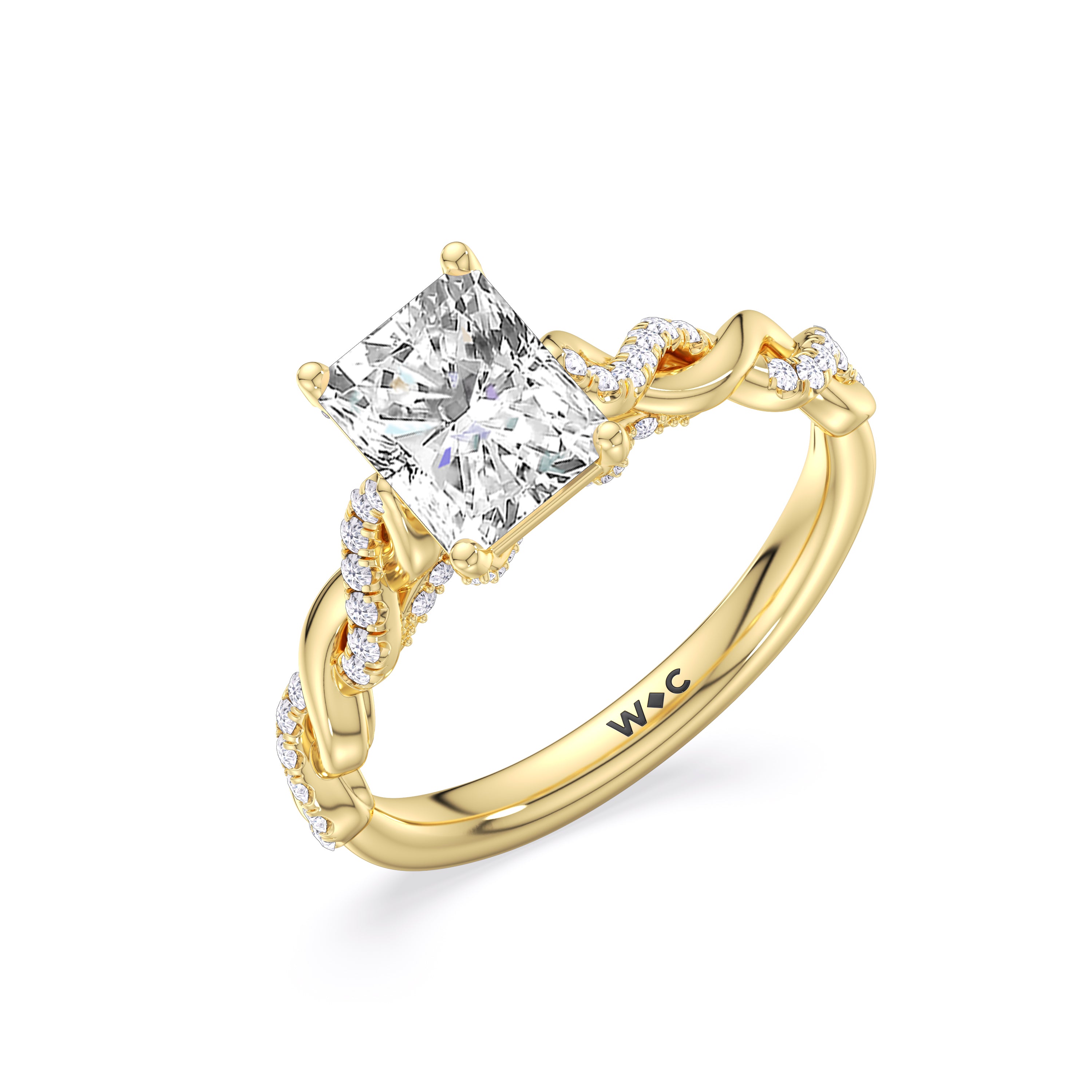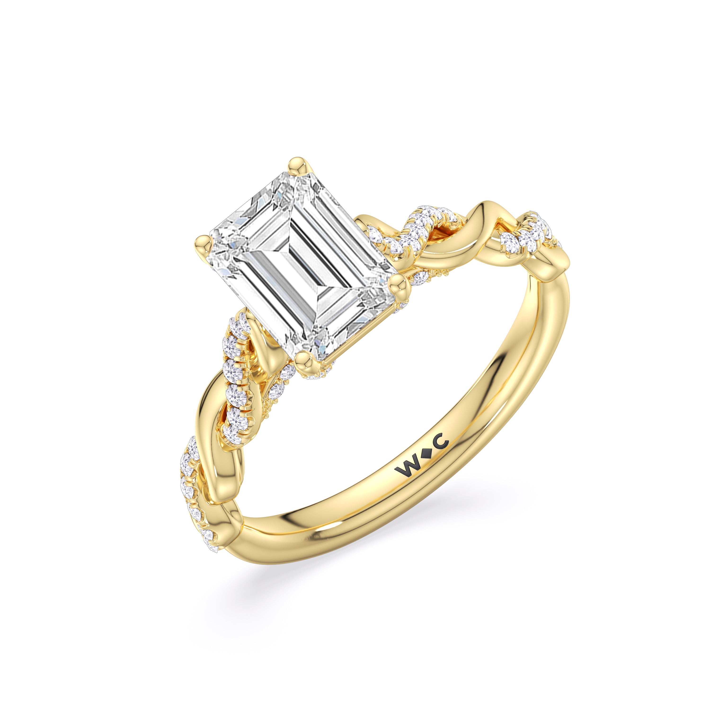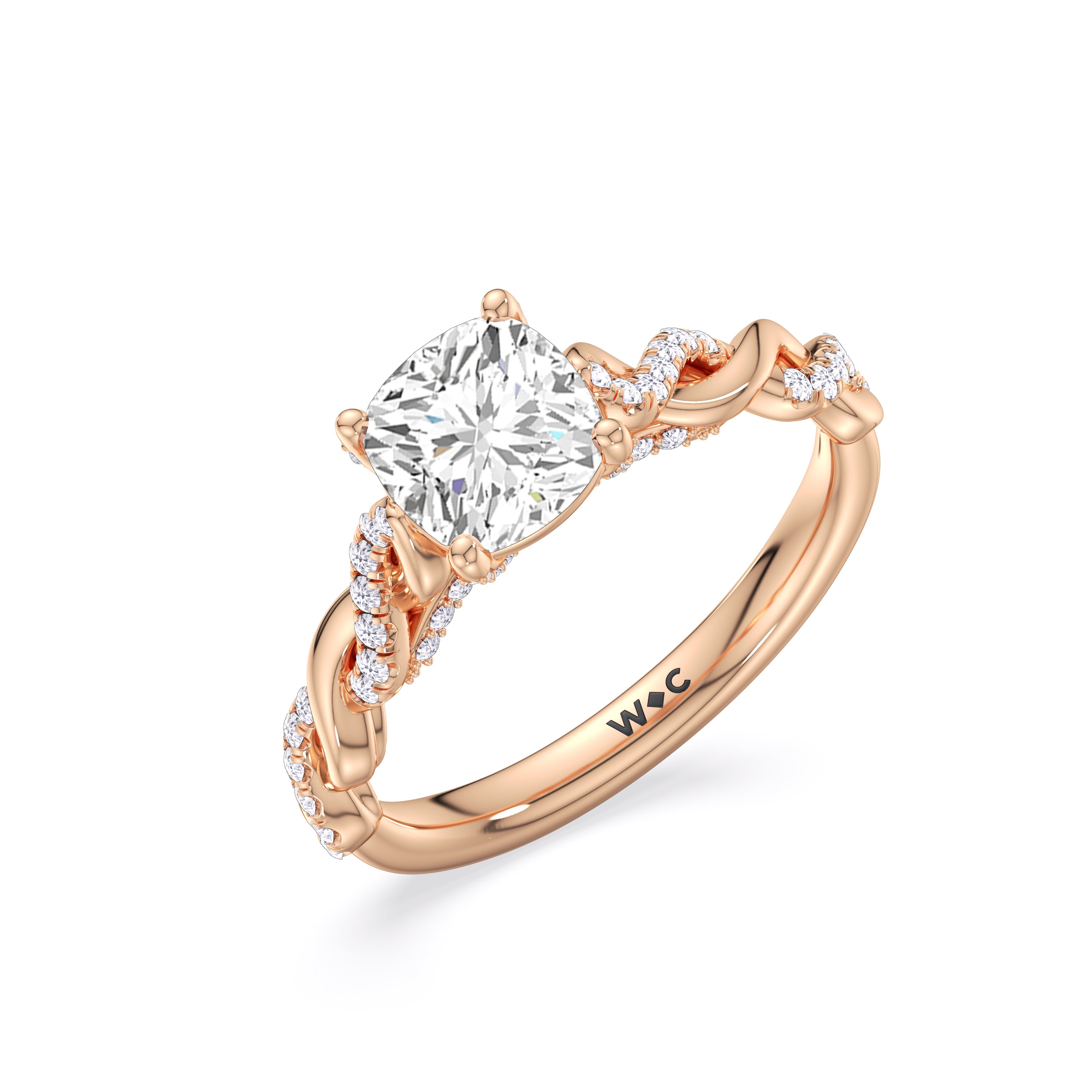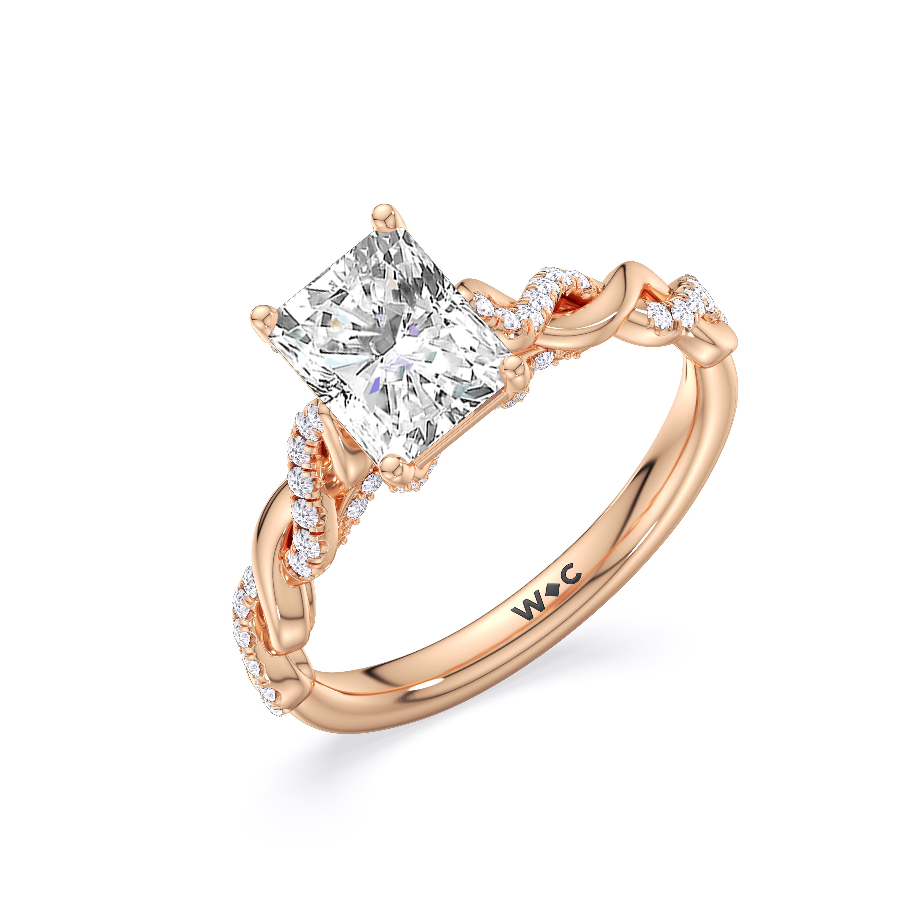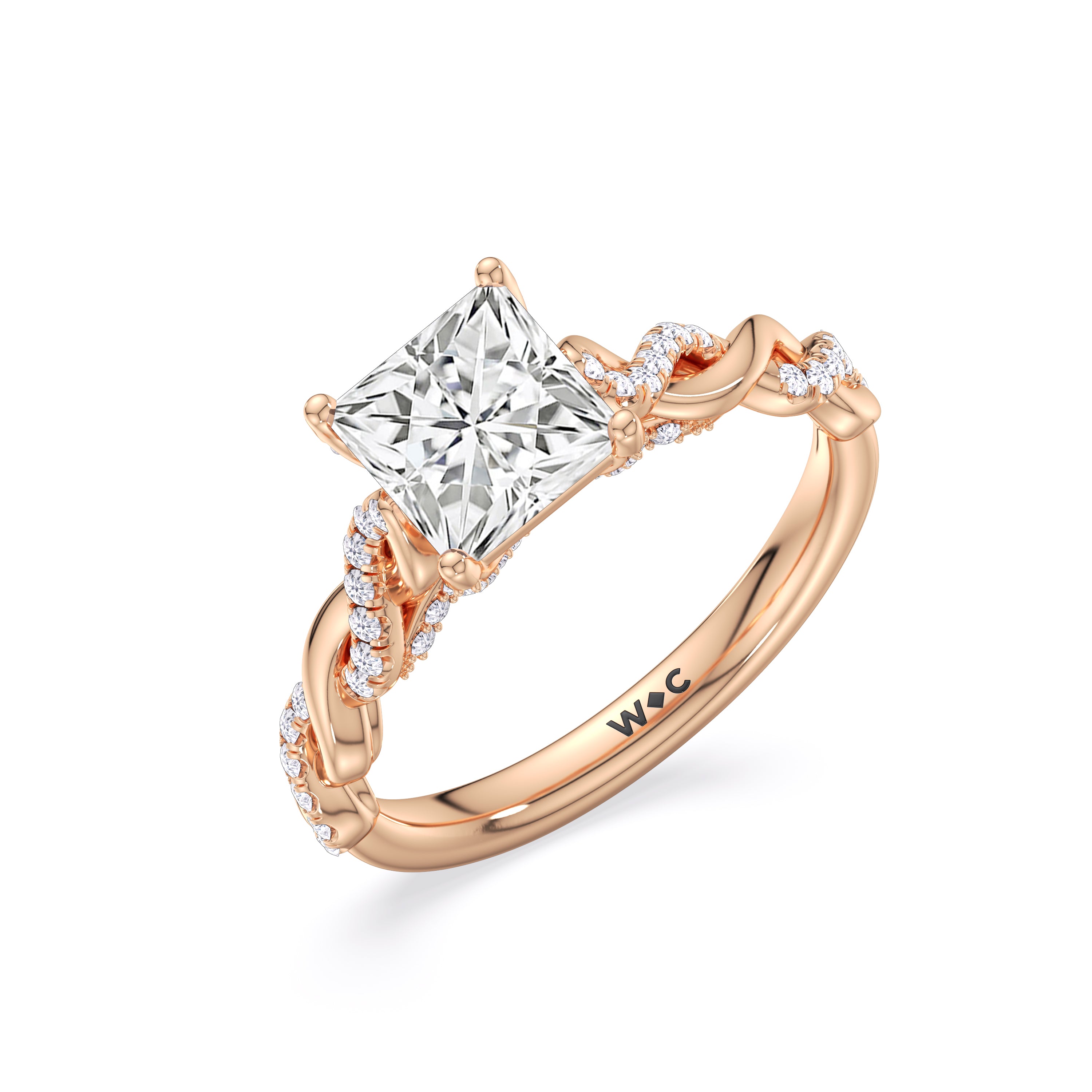 To showcase the dazzling centerpiece of this engagement ring, the embellished band splits to twist over and under itself up to flank the center stone, with the four prongs elegantly formed of sparkling crossover detail in the front view.