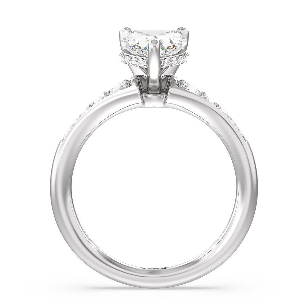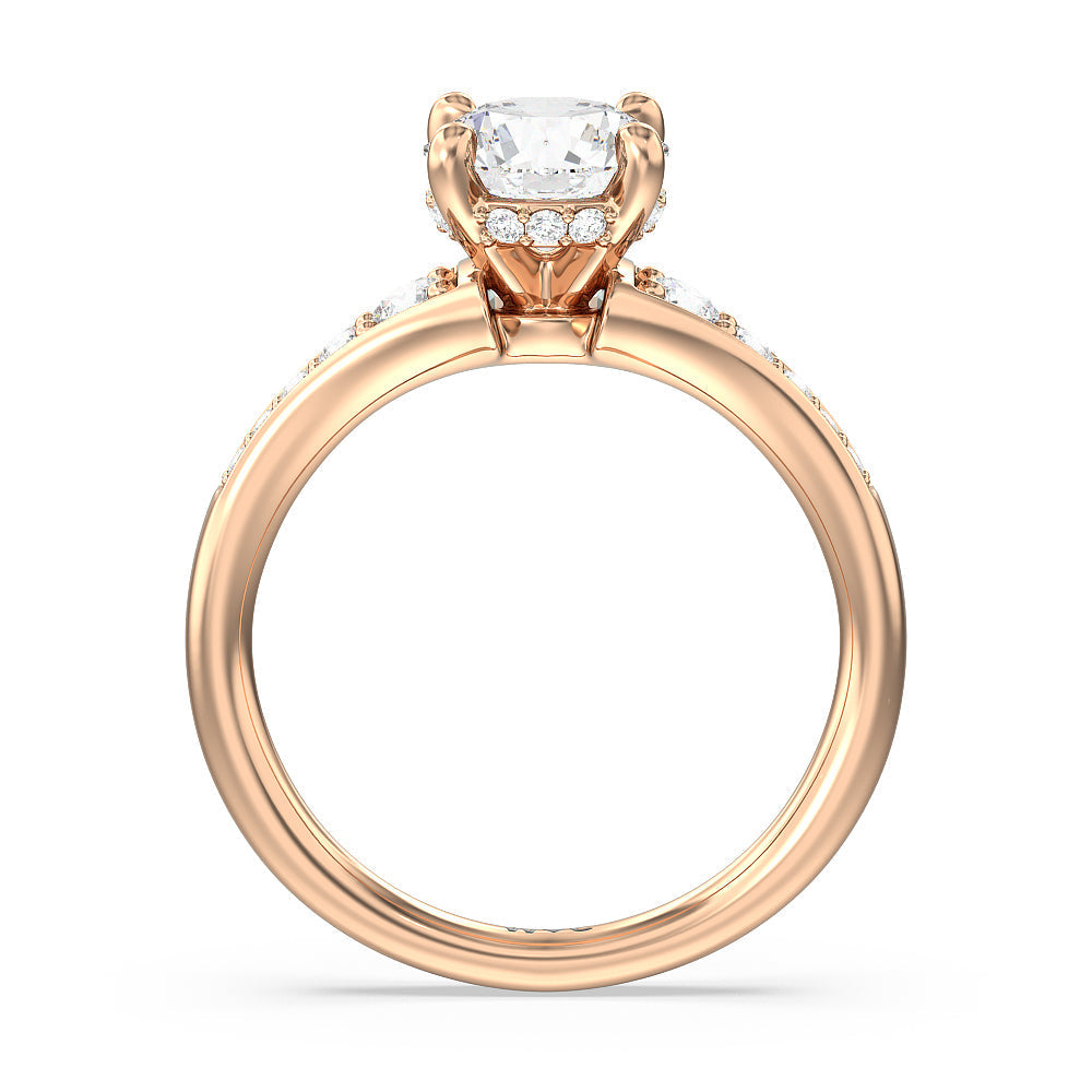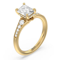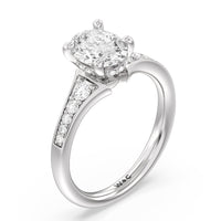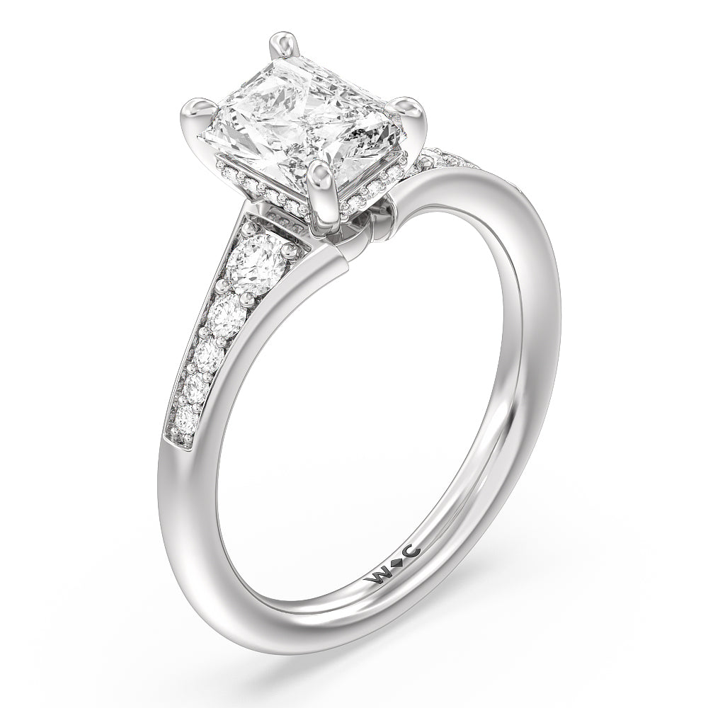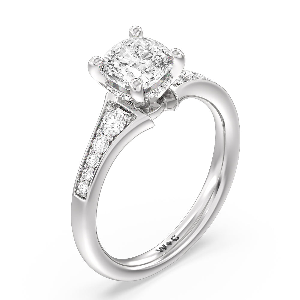 The delicate pave-set shank of this classic engagement ring draws the eye to a hidden halo accent around the elegant four-prong setting of the dazzling center-stone.