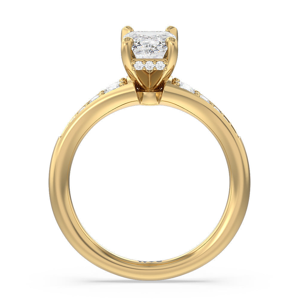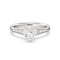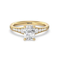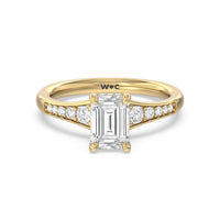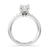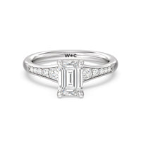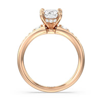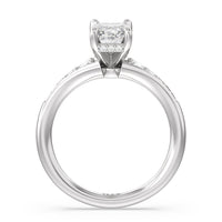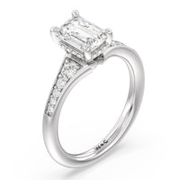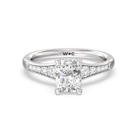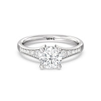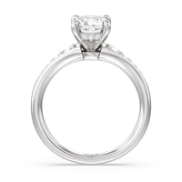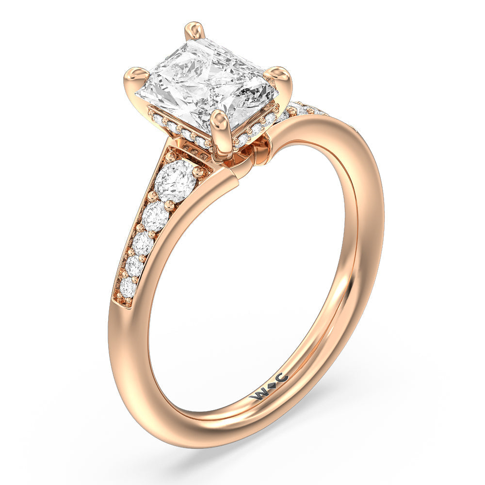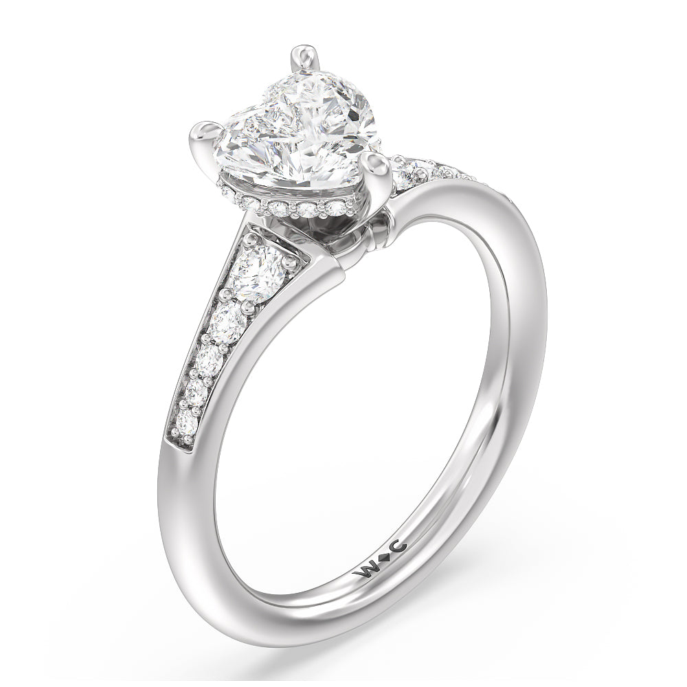 The delicate pave-set shank of this classic engagement ring draws the eye to a hidden halo accent around the elegant four-prong setting of the dazzling center-stone.