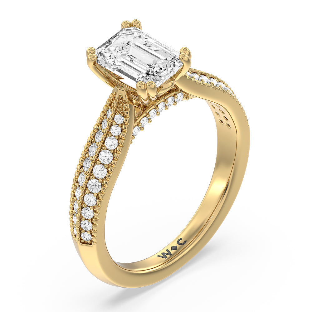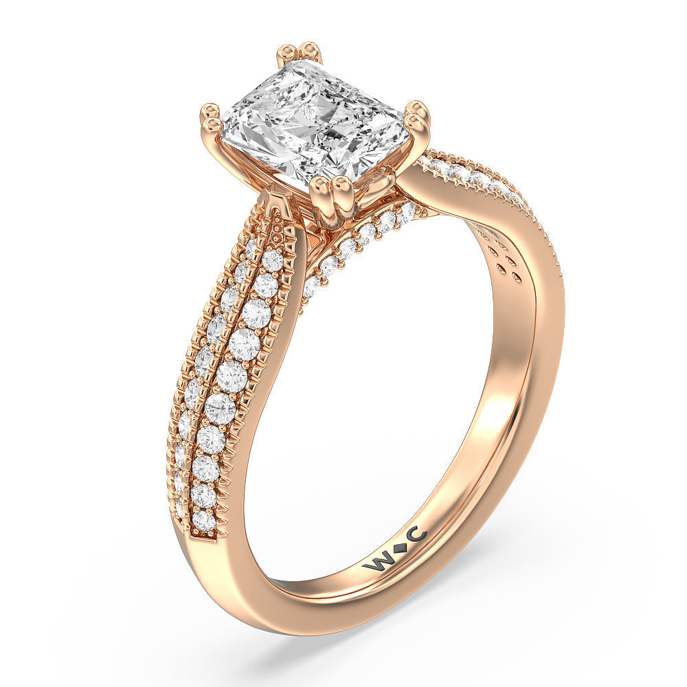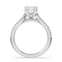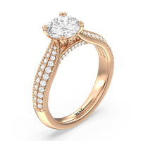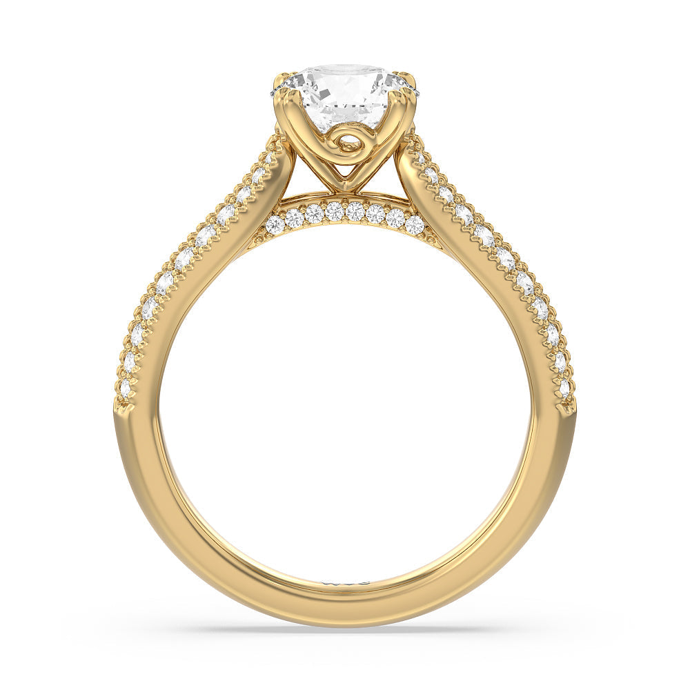 The beautiful cathedral shank of this regal engagement ring tapers to meet the stunning center stone in its elegant four-prong setting. The delicate pave diamond and milgrained knife-edge detailing creates a stunningly embellished design.