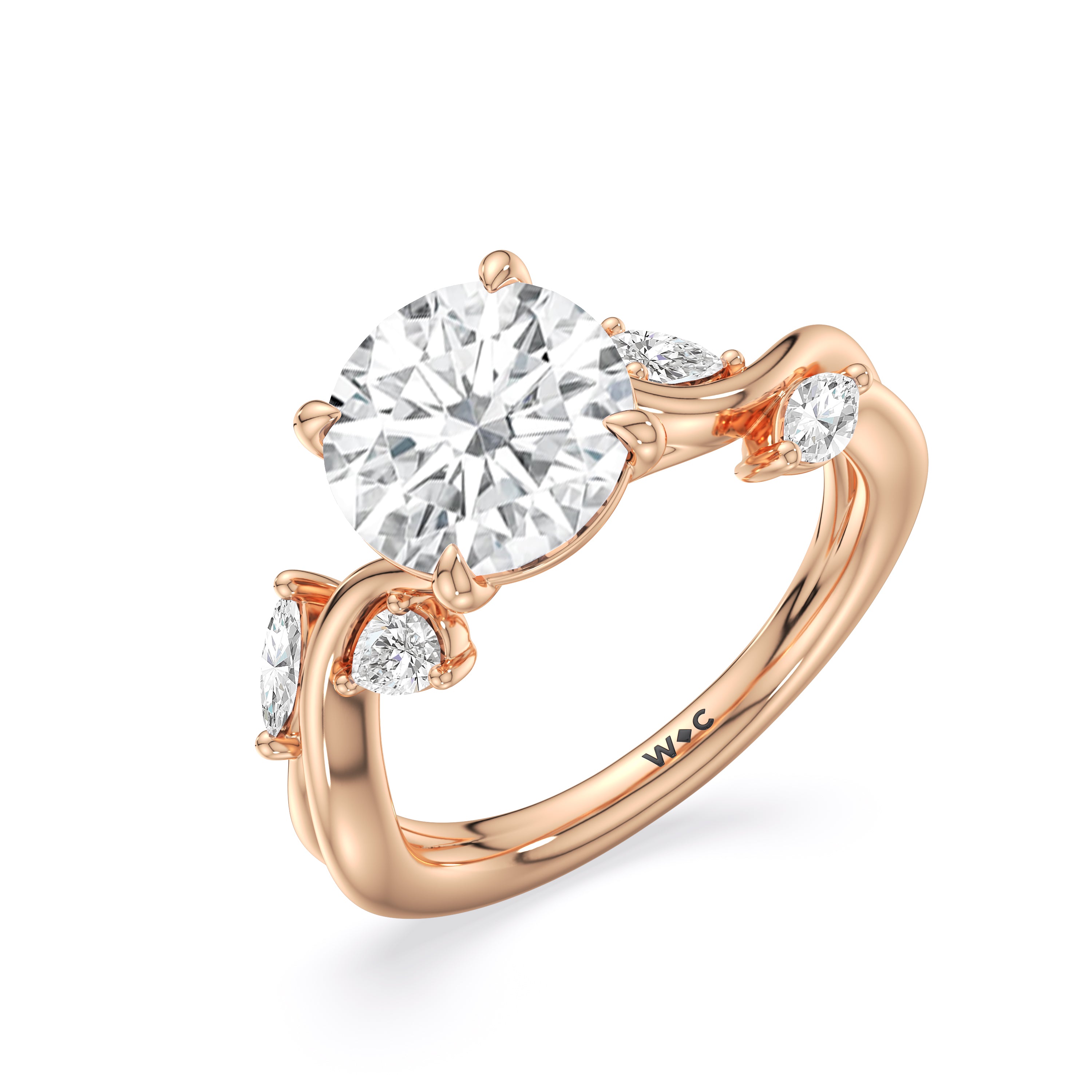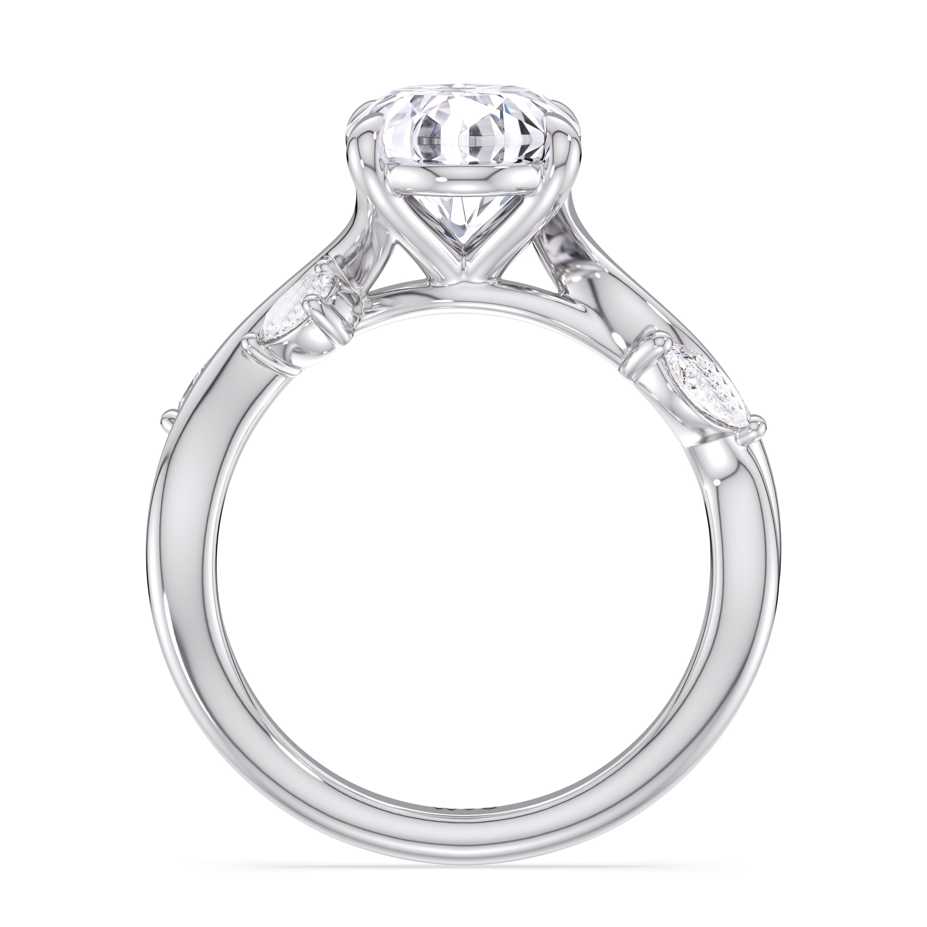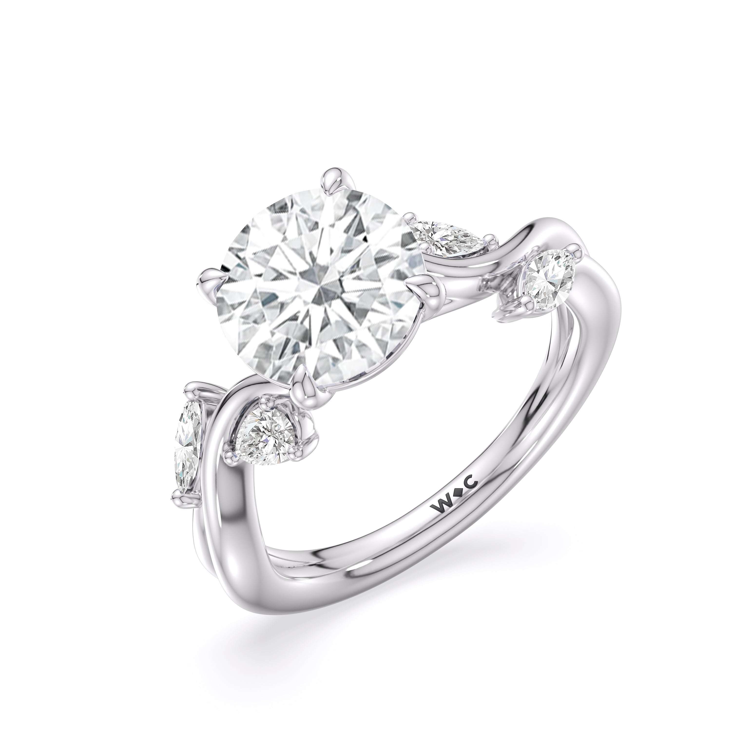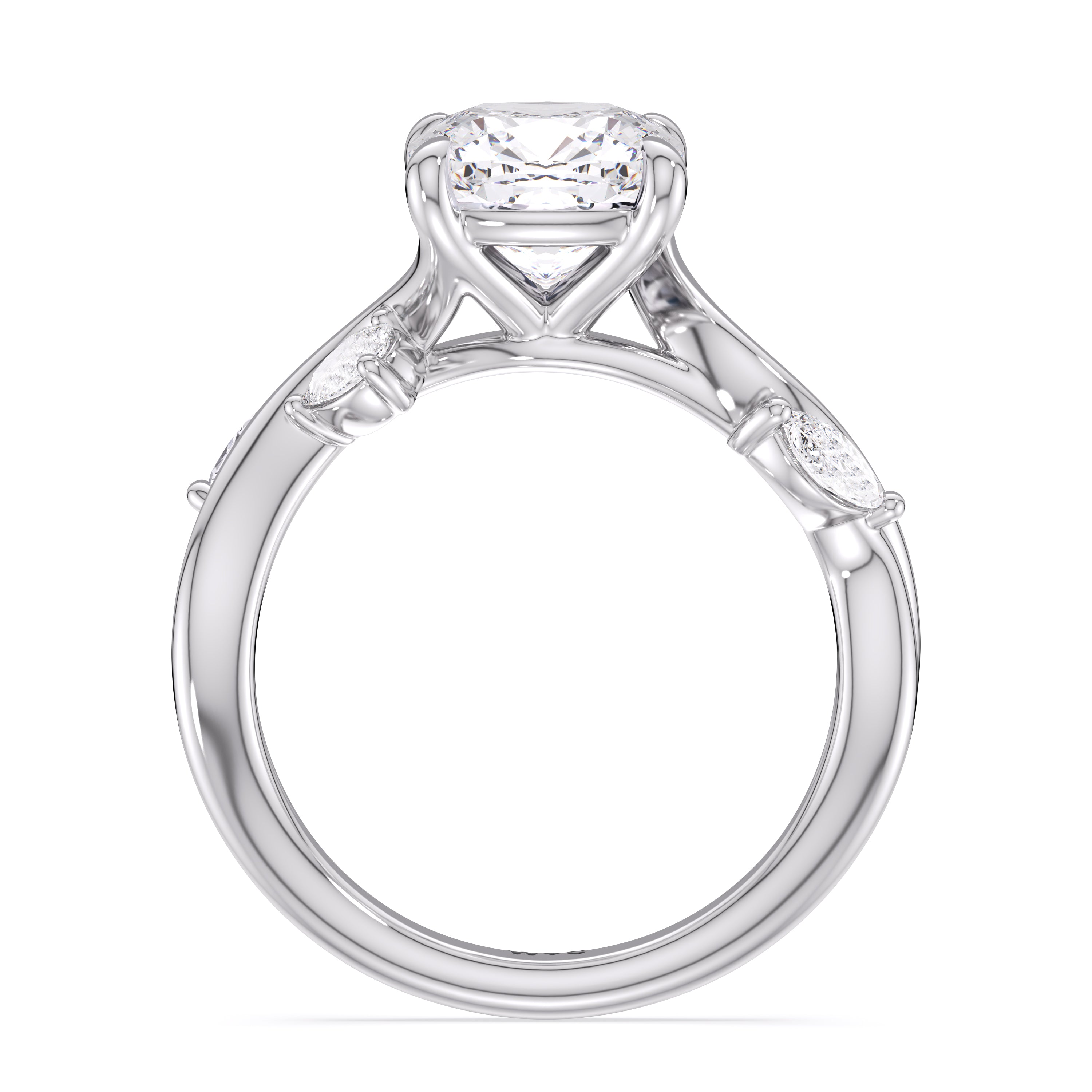 This diamond engagement ring is a picture of timeless romance. It features a band with vine-like twisting shoulders punctuated with pear and marquise diamonds that mimic leaves on a climber. The highlight of the ring is a meticulously selected diamond center stone sparkling with boundless brilliance. With nothing unnecessary to distract the eye, this ring presents a lasting style that is unwavering as your love.