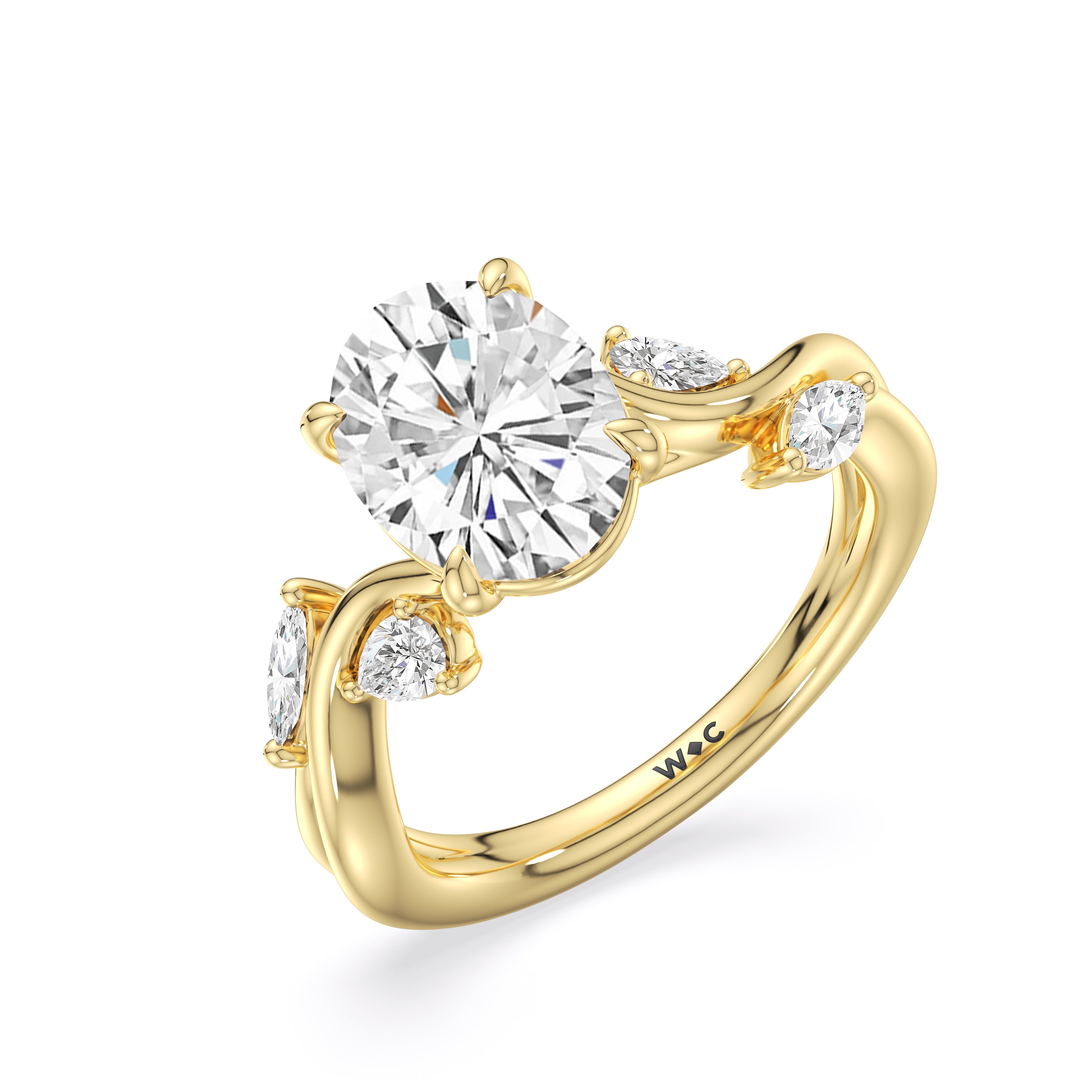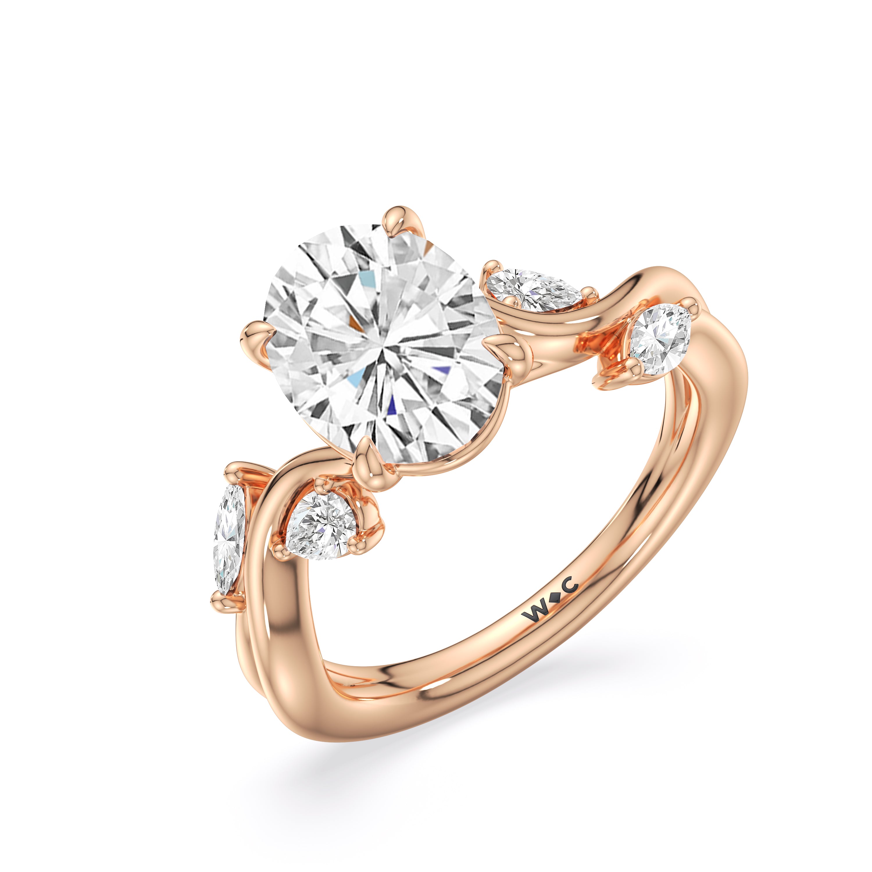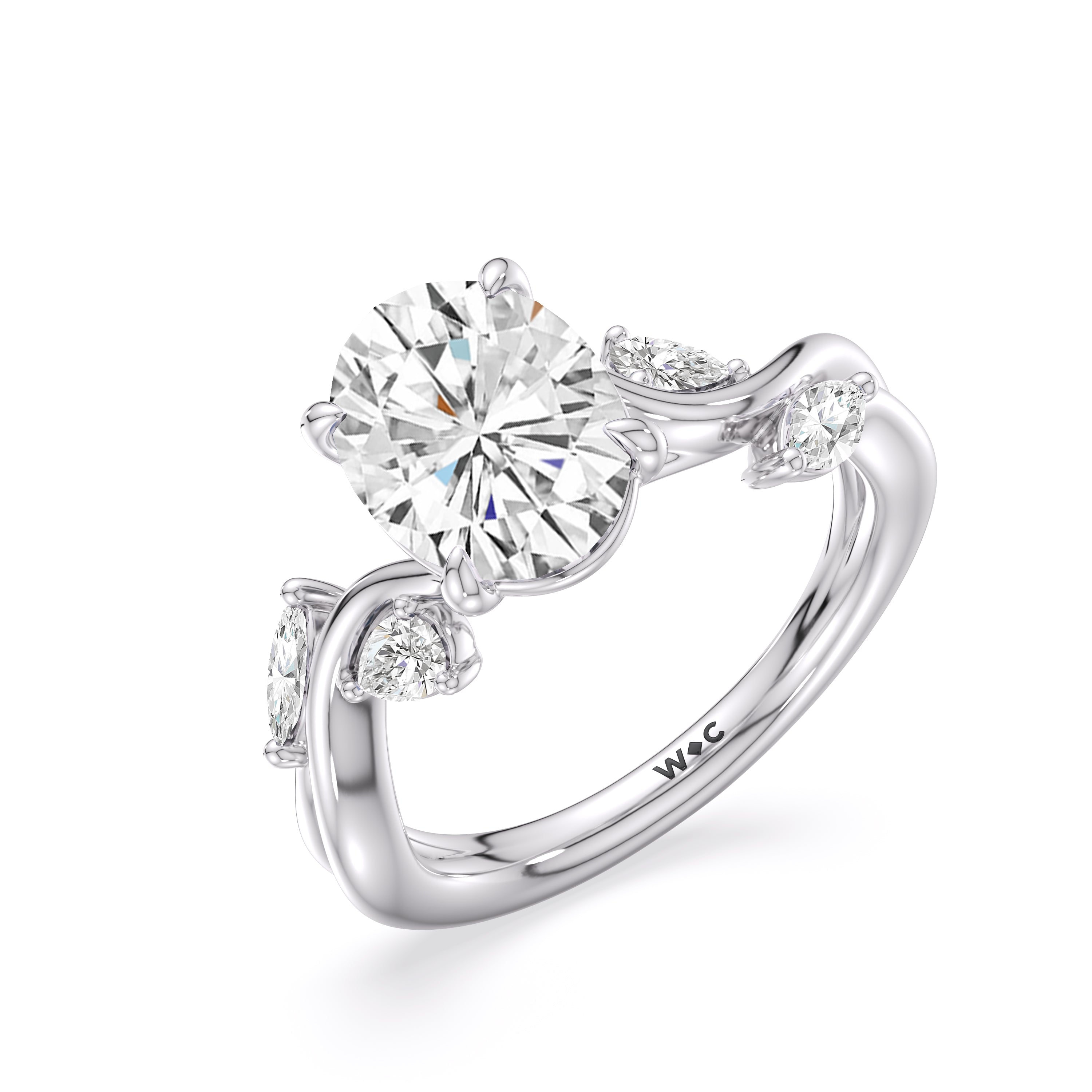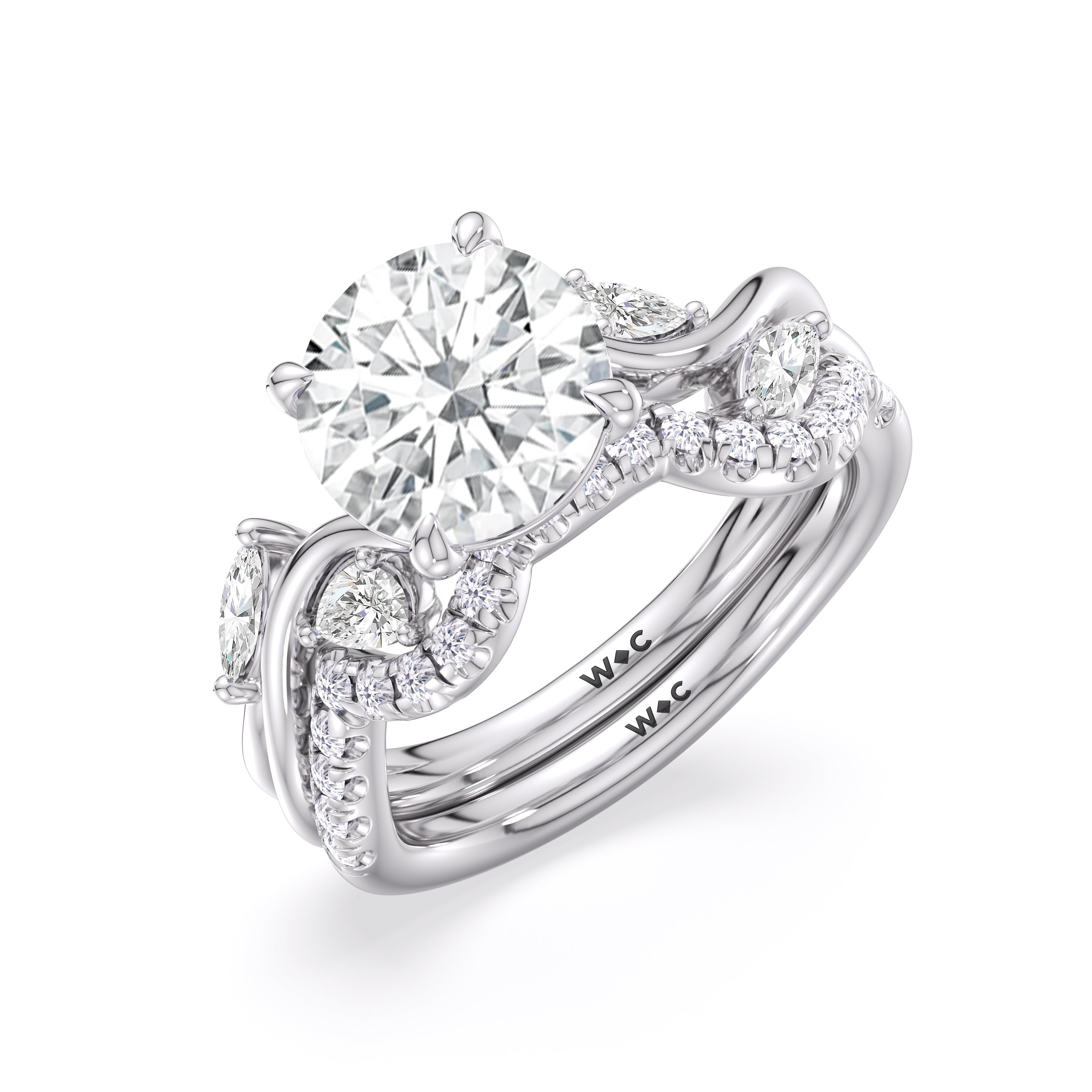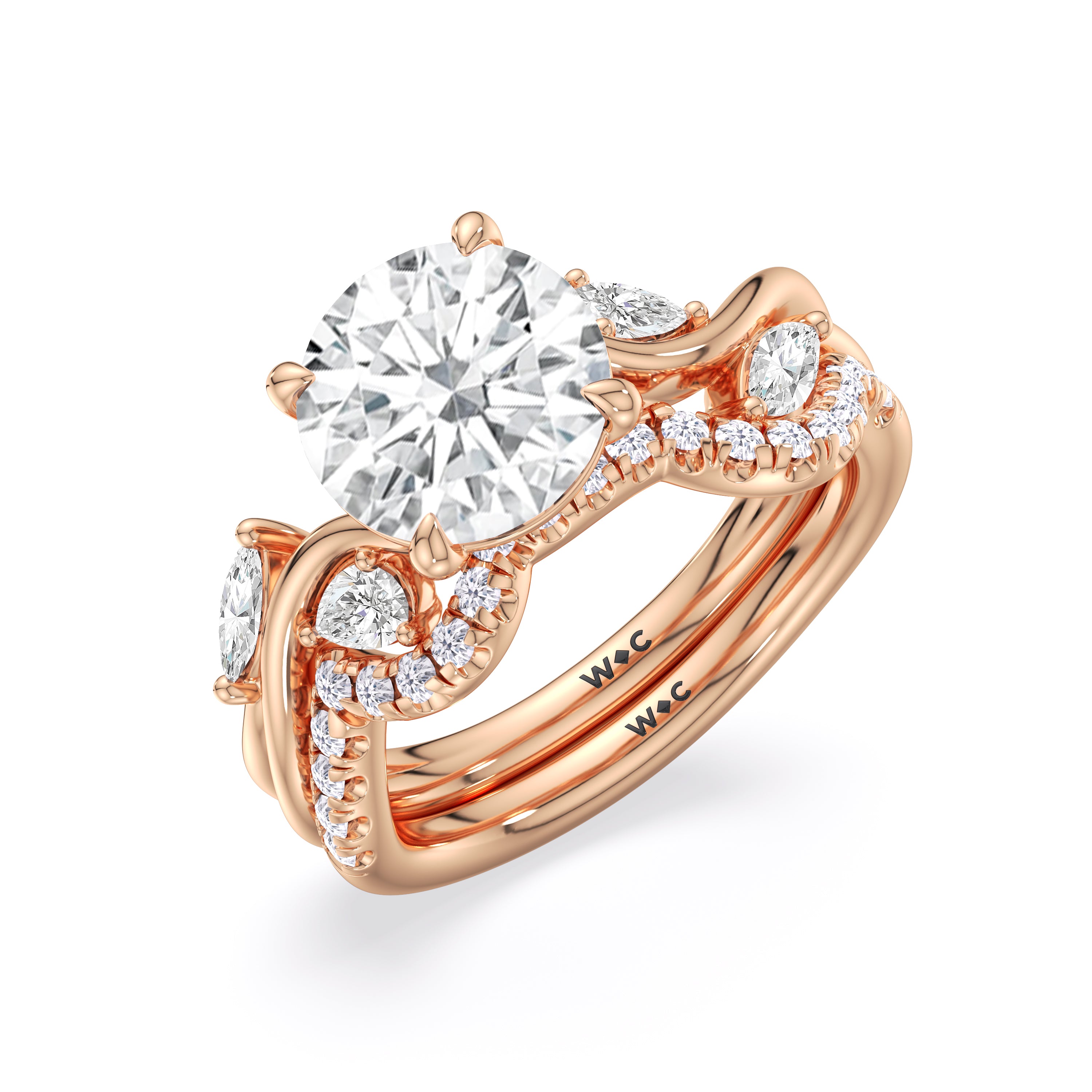 This diamond engagement ring is a picture of timeless romance. It features a band with vine-like twisting shoulders punctuated with pear and marquise diamonds that mimic leaves on a climber. The highlight of the ring is a meticulously selected diamond center stone sparkling with boundless brilliance. With nothing unnecessary to distract the eye, this ring presents a lasting style that is unwavering as your love.