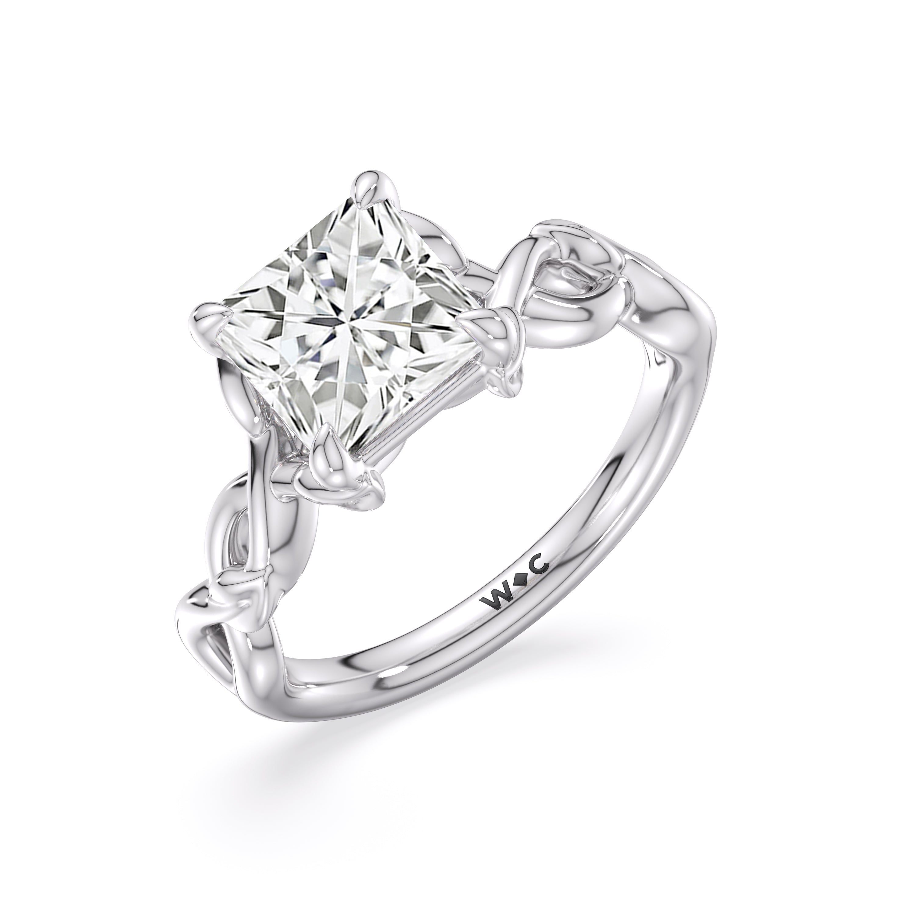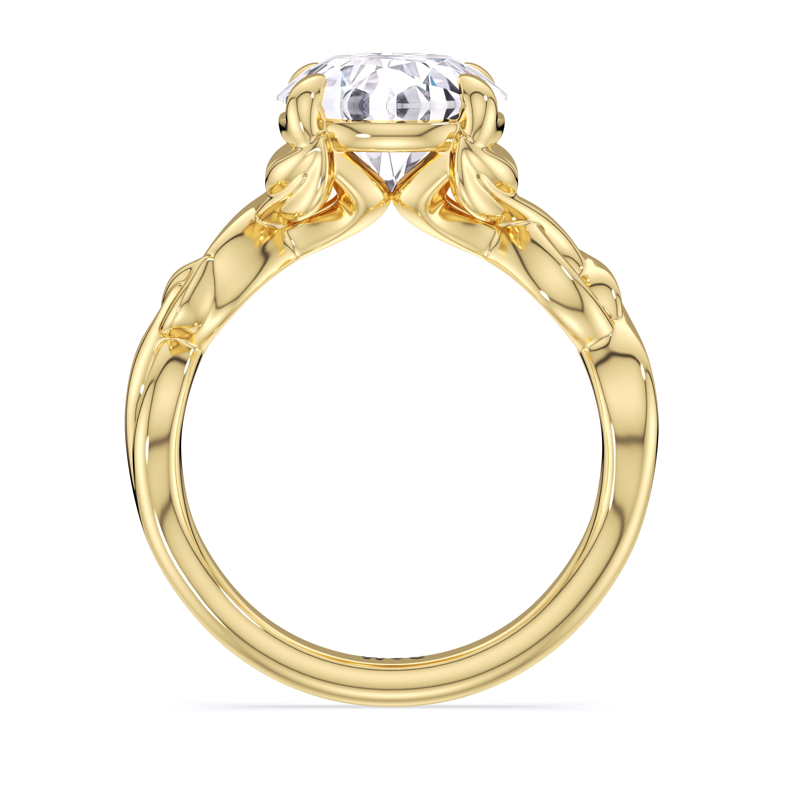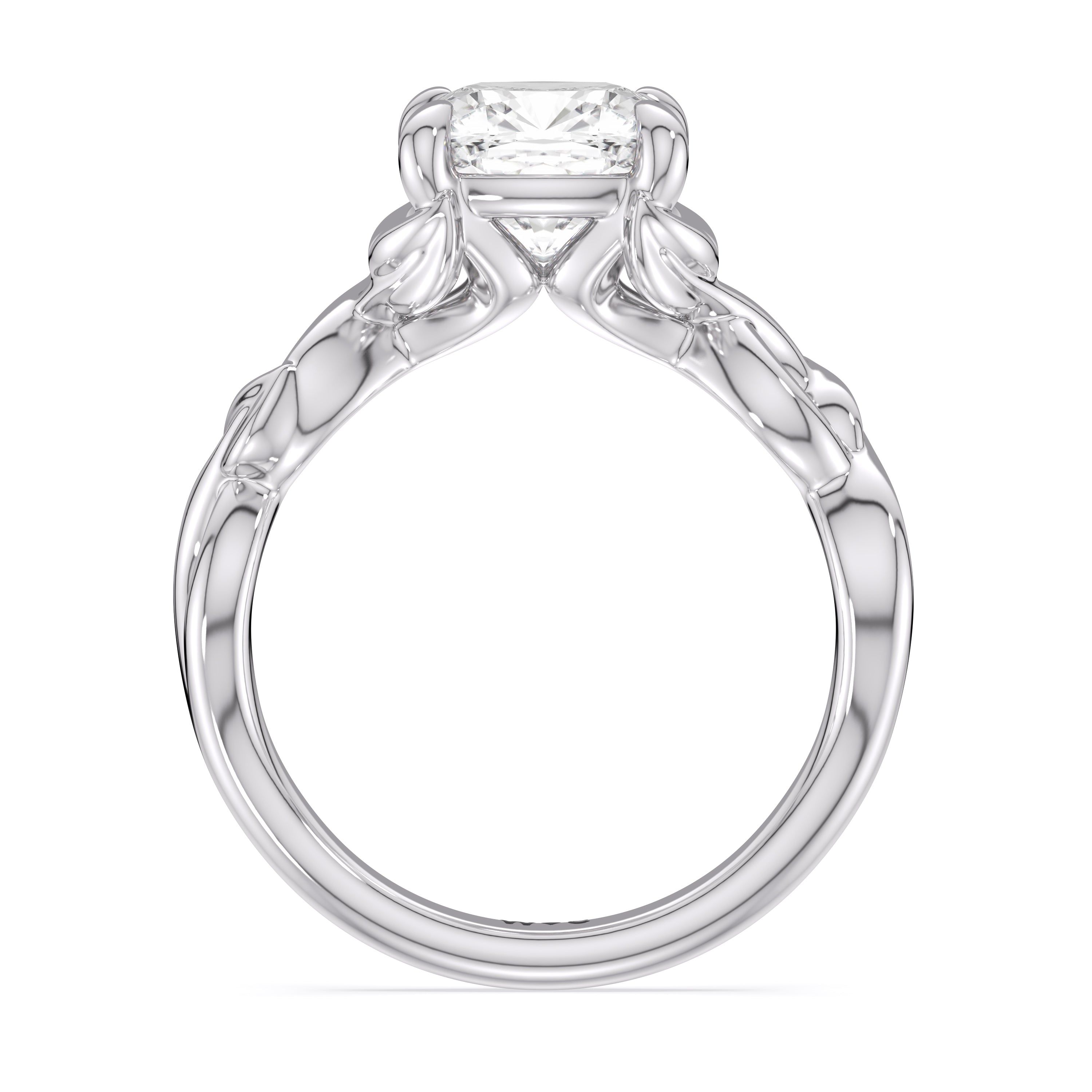 A ring of enchanting beauty, this engagement ring is artfully designed to represent your unbreakable bond. The ring has ornamental vine shoulders symbolizing how you, as a couple, are stronger together than apart. The twisting vine shoulders lead to a marvelous diamond center stone secured by claw prongs.