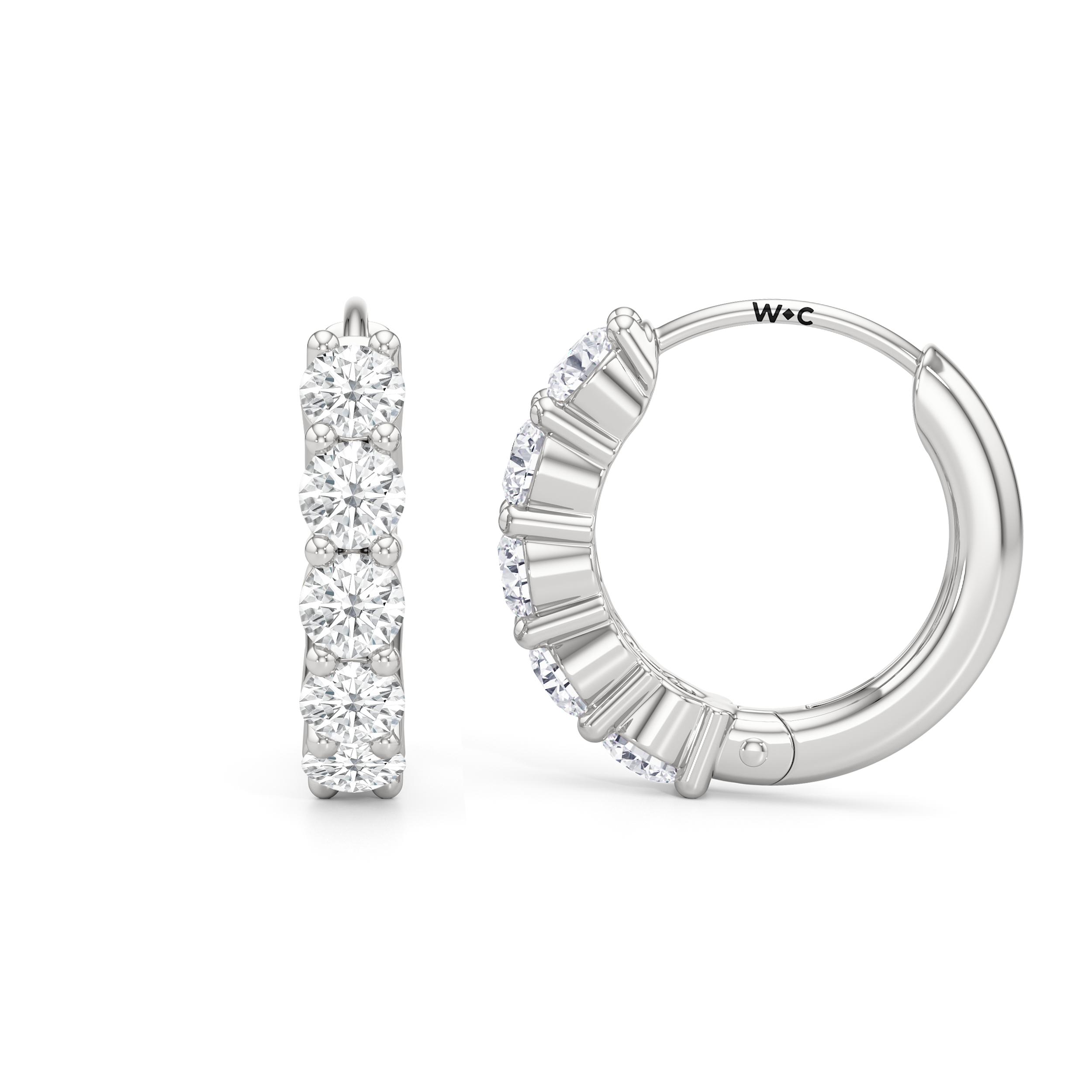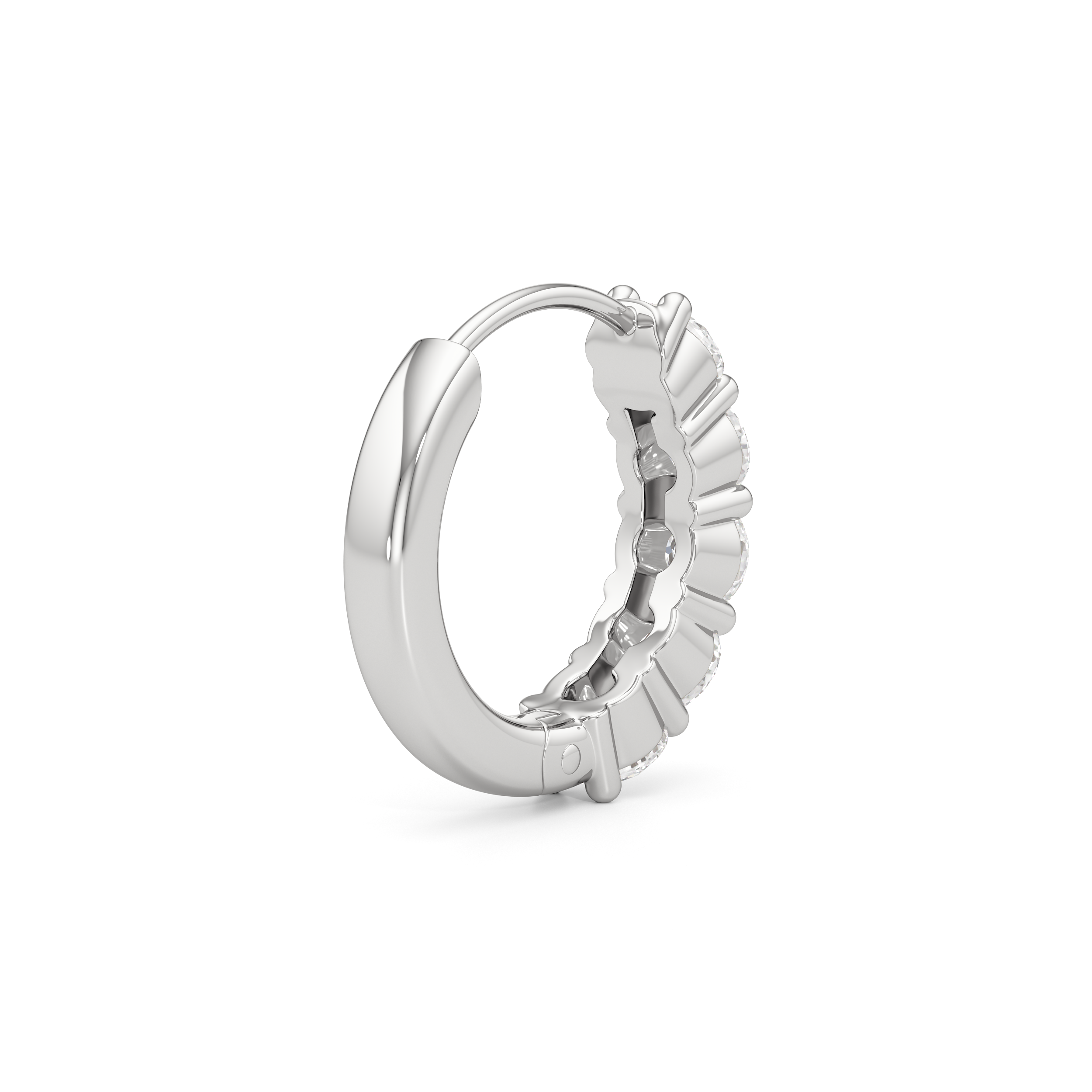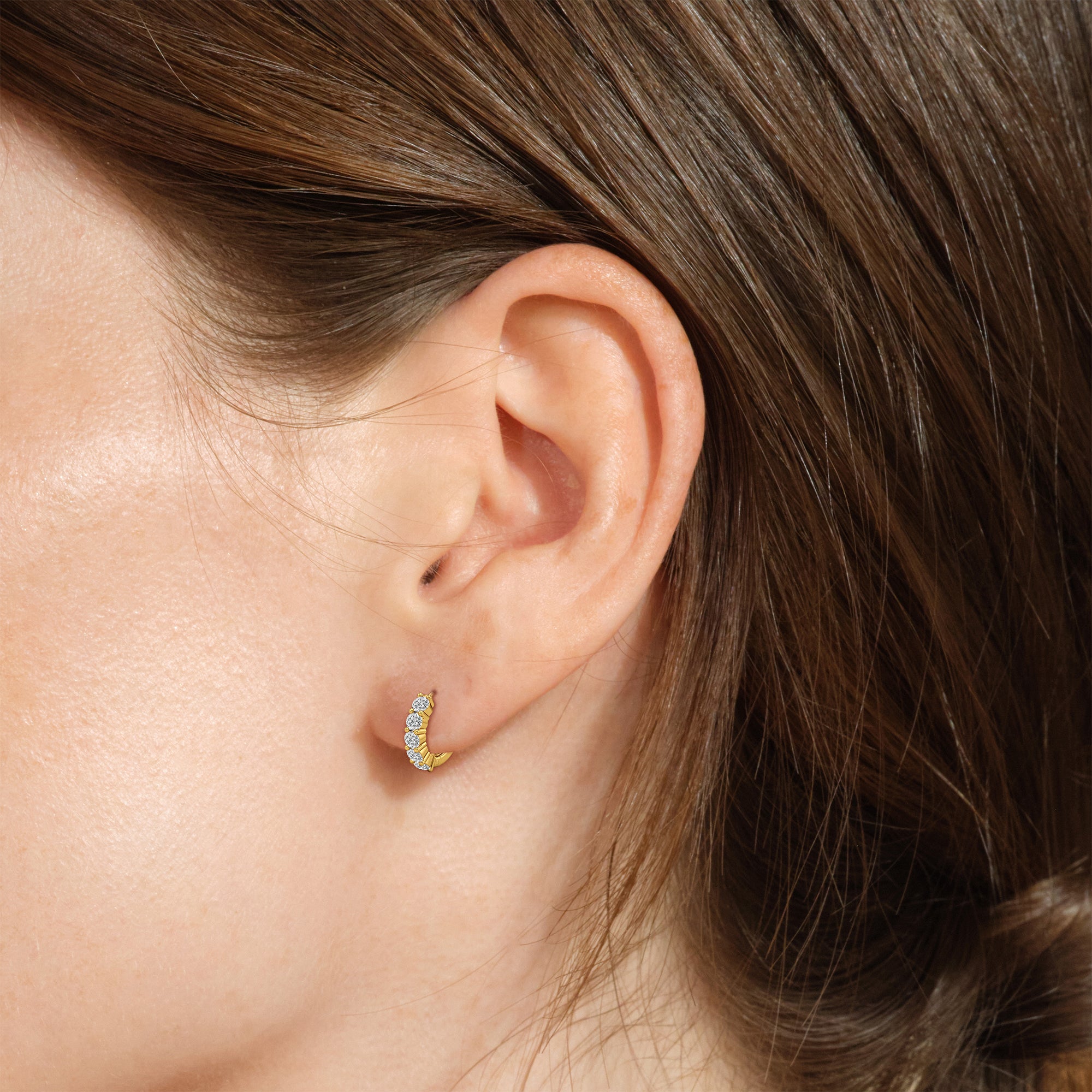 Willow bends, flows, and follows your rhythm. The kind you’ll wear all day—without a second thought. These petite hoops hug the ear just right. The front contour comes lined with diamonds on shared prongs, giving the illusion of an uninterrupted line of sparkle.